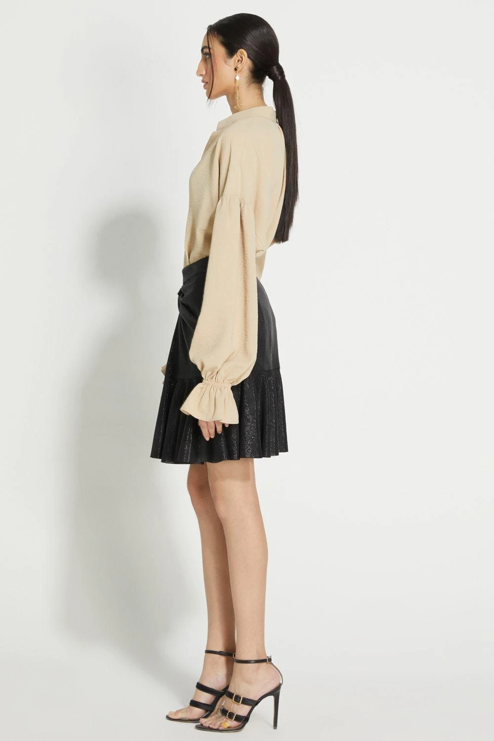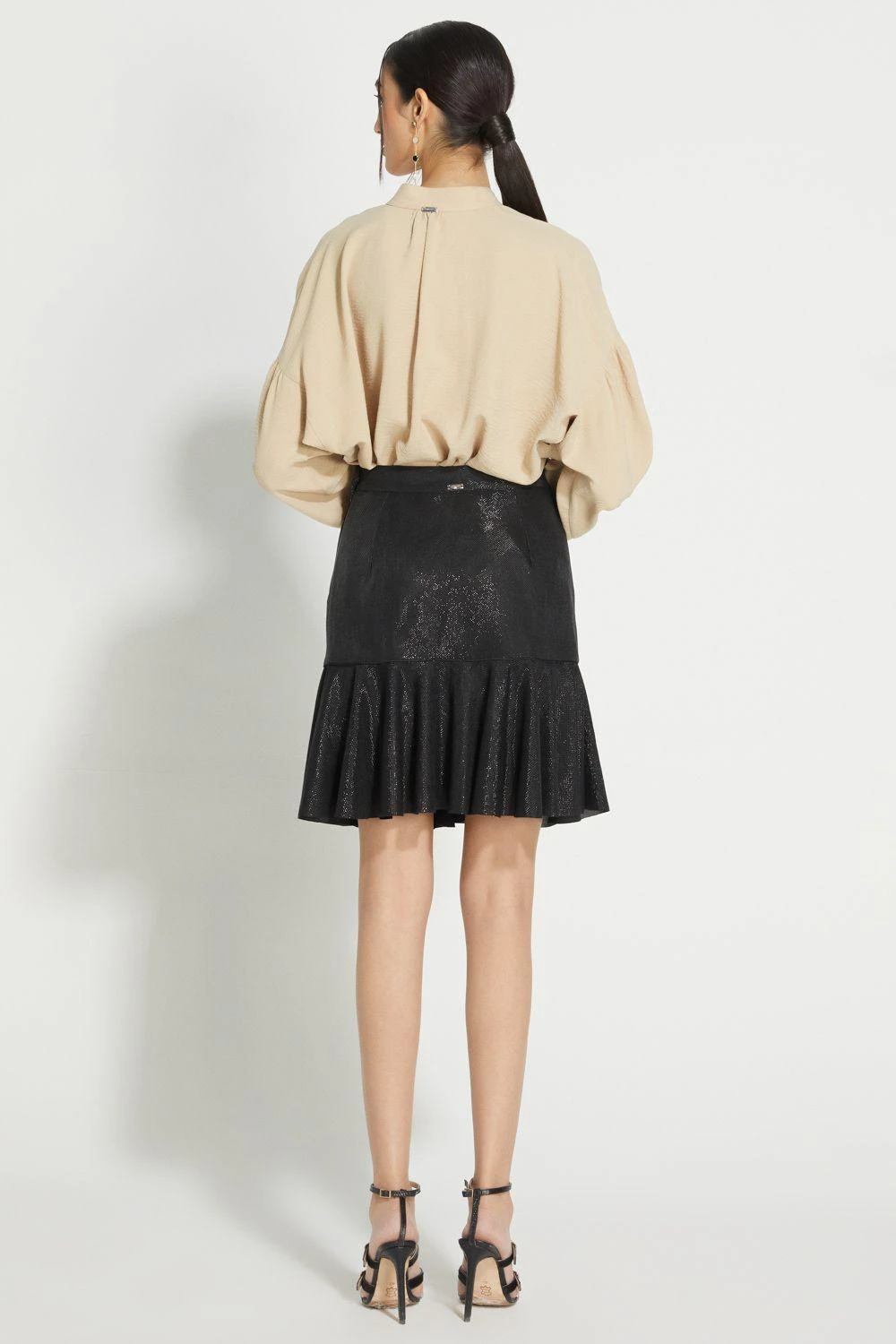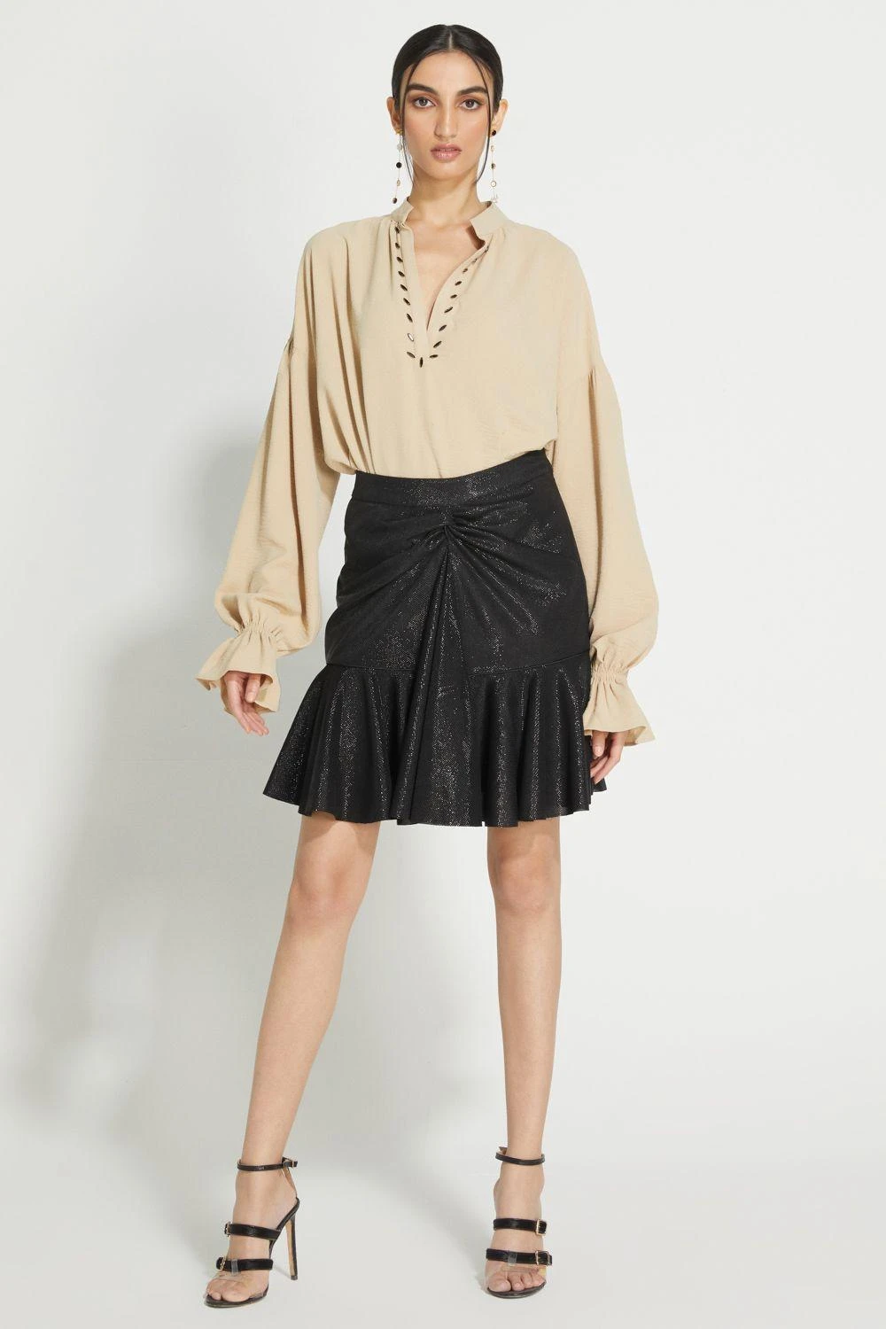 This black mini skirt is the essential party piece made in shimmery jersey fabric. It features a knot twist detail at the waist and flares out into a ruffled hem. You can style it with a statement shirt from the collection.