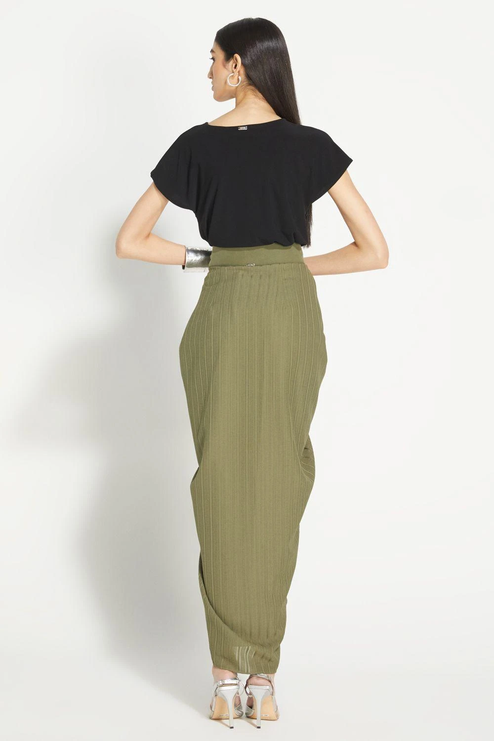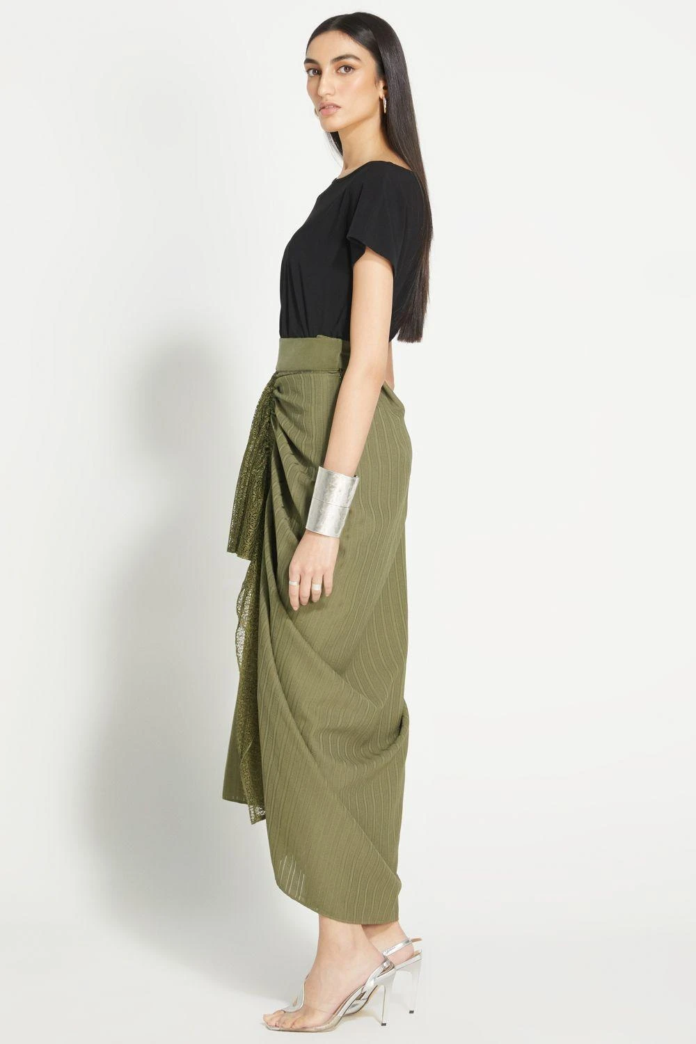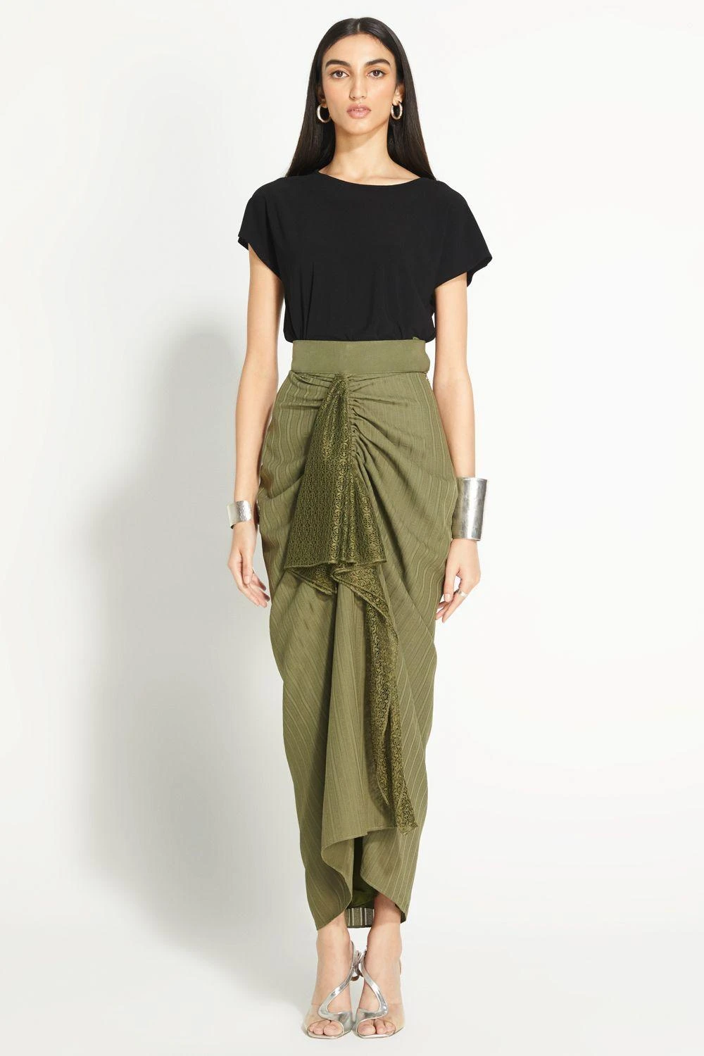 This olive drape skirt will fetch you a slinky look with its glove fit. It plays with fabric textures with a front net drape & a leather waistband. You can style it with a black muscle top from the collection.