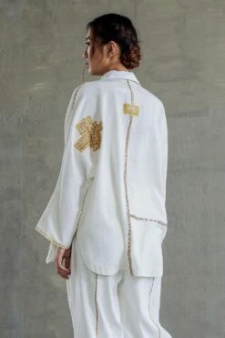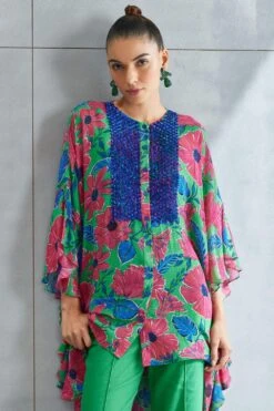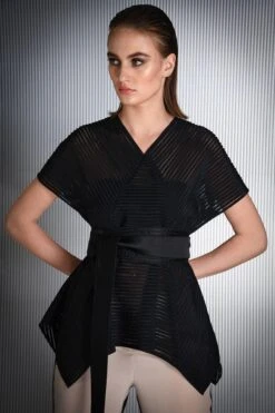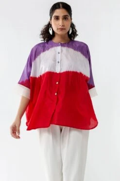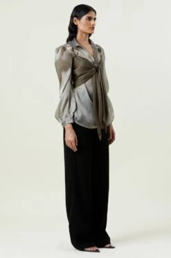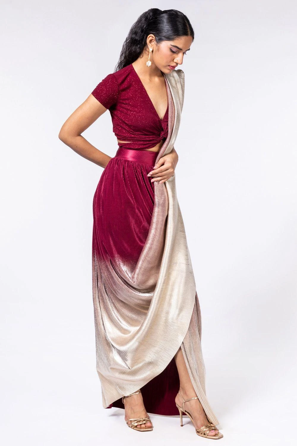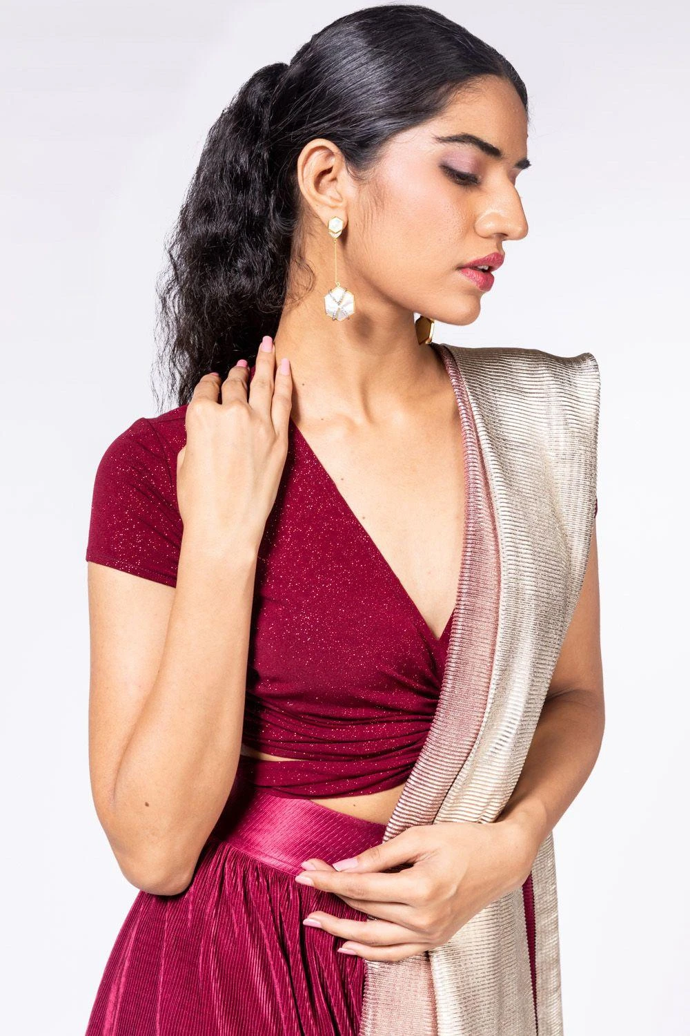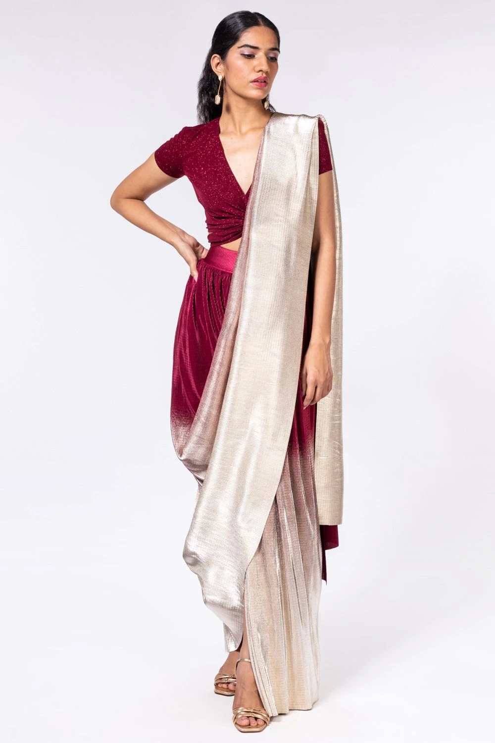 This wine blouse is set in a shimmery jersey fabric with a neckline and ruched front detailing. You can team it up with a matching draped sari from this collection for a chic cocktail look.