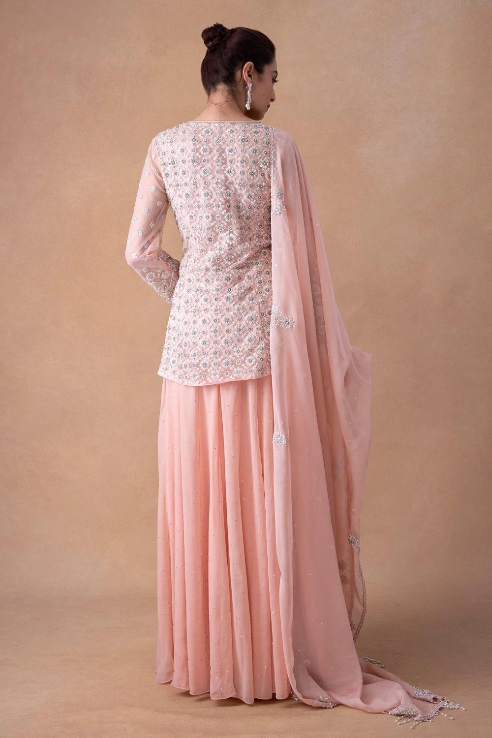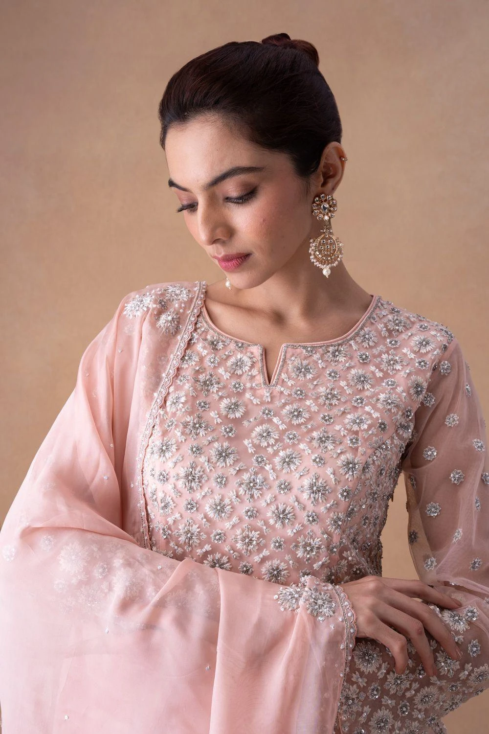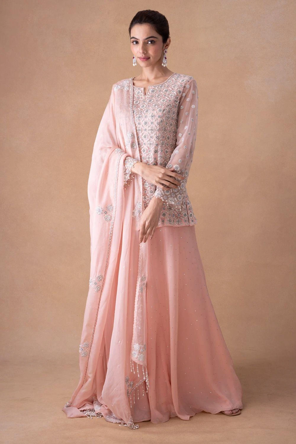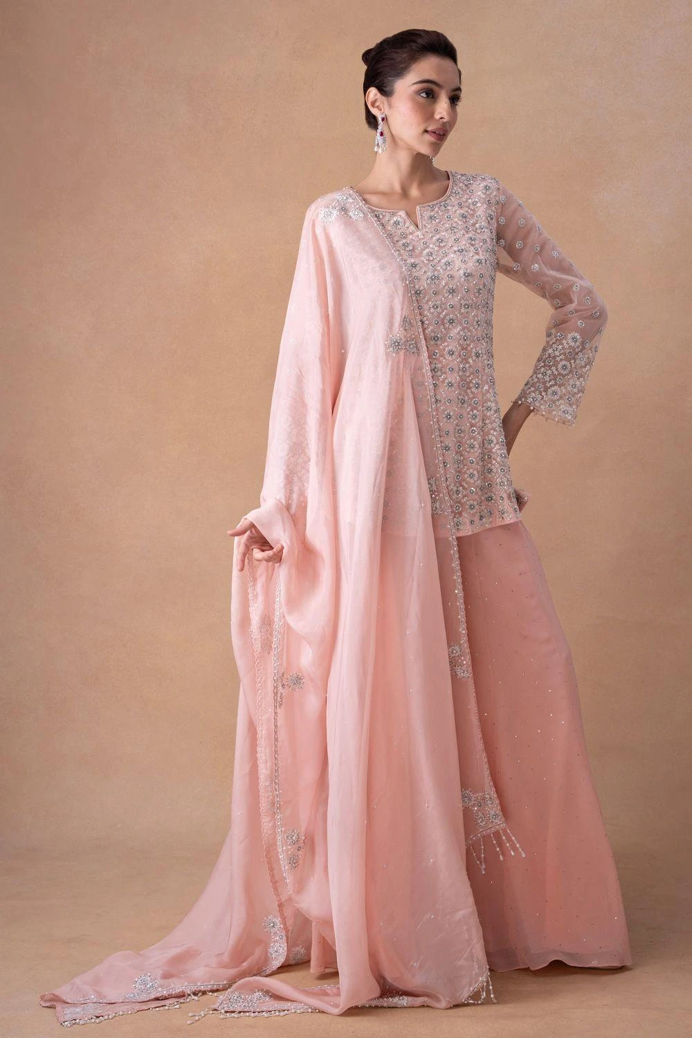 Indulge in luxury with the Azalea Pink Floral Kurta-Sharara Set. Fashioned in georgette, adorned with pearls & sequins, this ensemble features a charming kurta, paired elegantly with a sharara & a graceful dupatta. Elevate your style with allure.