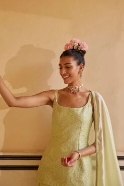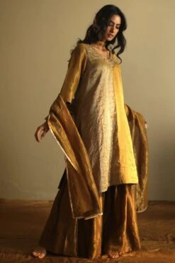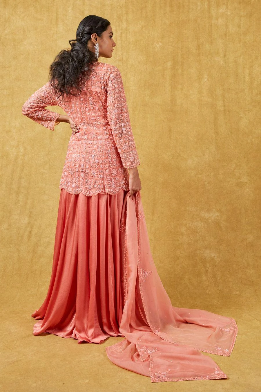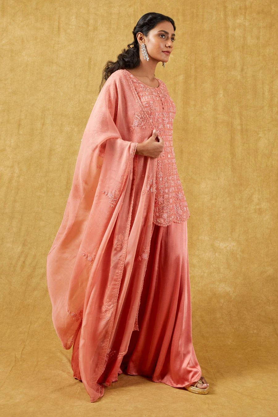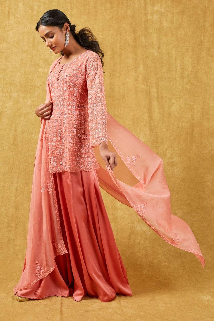 This sharara set will see you through all celebrations this wedding season. Crafted in satin organza, this set features a crystal embellished kurta, a sharara & dupatta. Style this comfortable silhouette with statement earrings to complete the look.