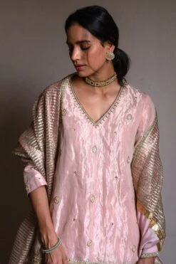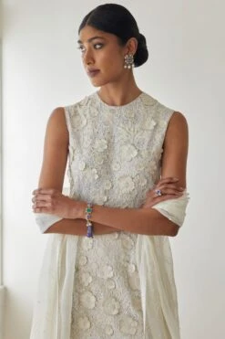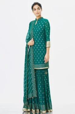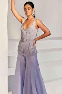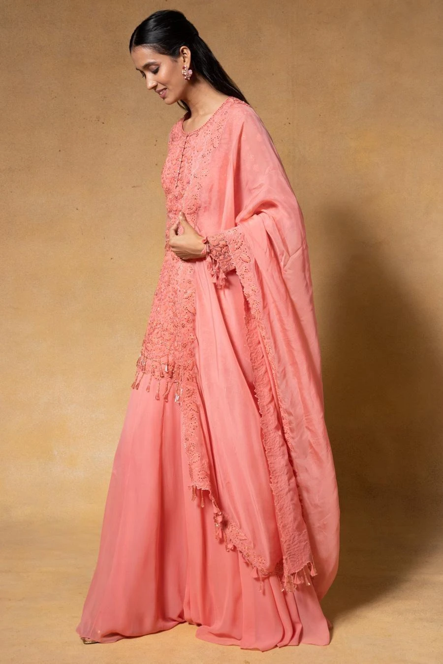 This sharara set will see you through all kinds of celebrations, this wedding season. Crafted in georgette, this set features a floral embellished kurta with a crop top, sharara, belt & dupatta. Add a pair of statement earrings to complete the look.