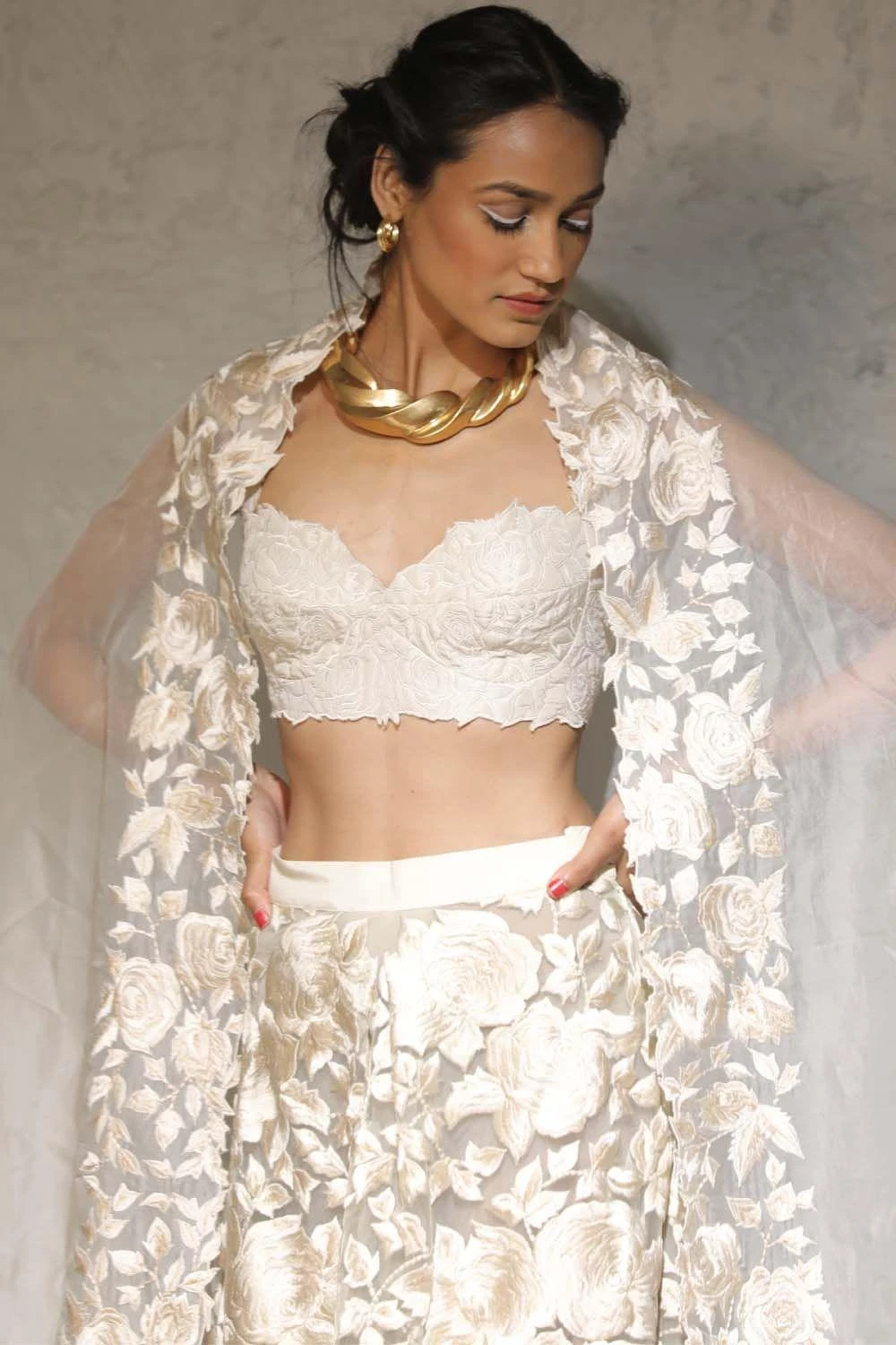 This elegant off white silk blouse is quilted in Aikeyah’s signature floral motifs. This stunning piece can be styled as part of a lehenga set with traditional jewellery.