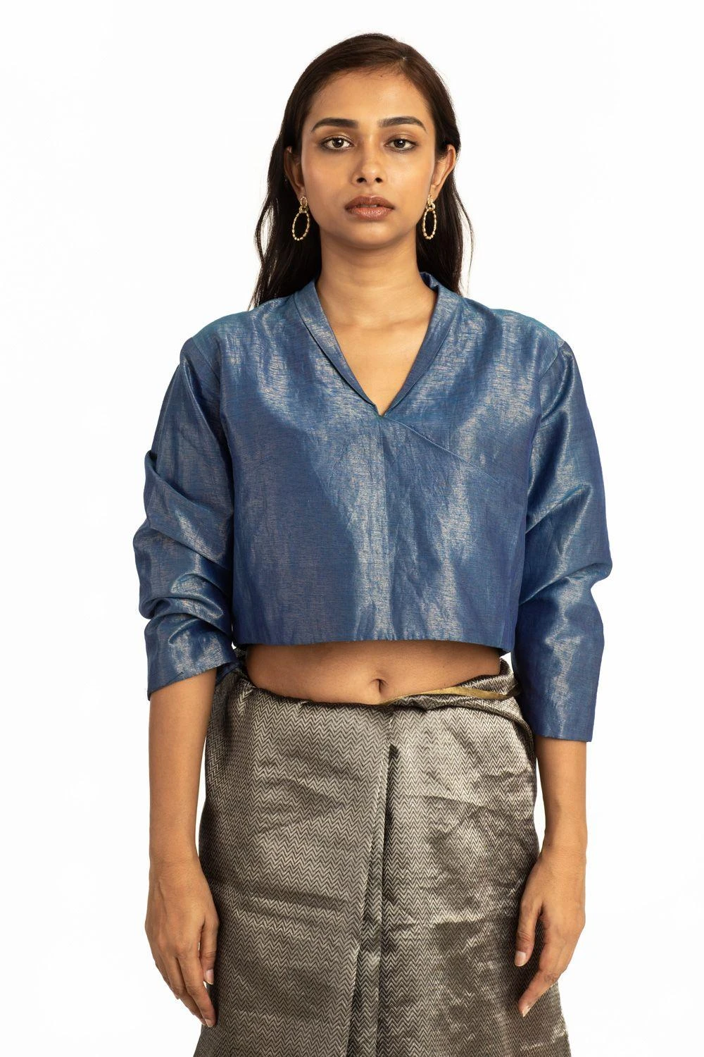 This statement blue blouse will perfectly complement a silk sari. It will add a contemporary touch to your look. It is cut in silk zari fabric in a collared silhouette.