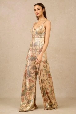 This draped jumpsuit is made in signature silk linen fabric and detailed with ochre stripes and a tie-up. It is a comforatble modern outfit for any day to evening passing events!