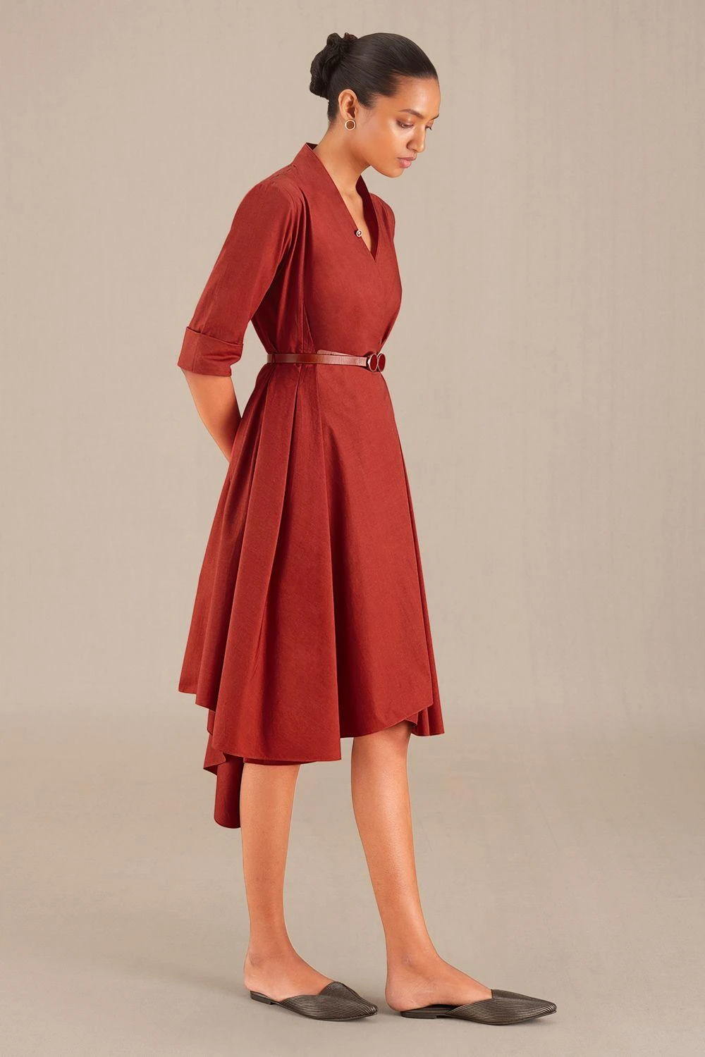 The red poplin Lara dress, cinched at the waist boasts a soft hemline for summer comfort. Pair it with the included belt. Add sandals or sneakers for casual daytime vibes or elevate with heels and statement accessories for a chic, versatile look.