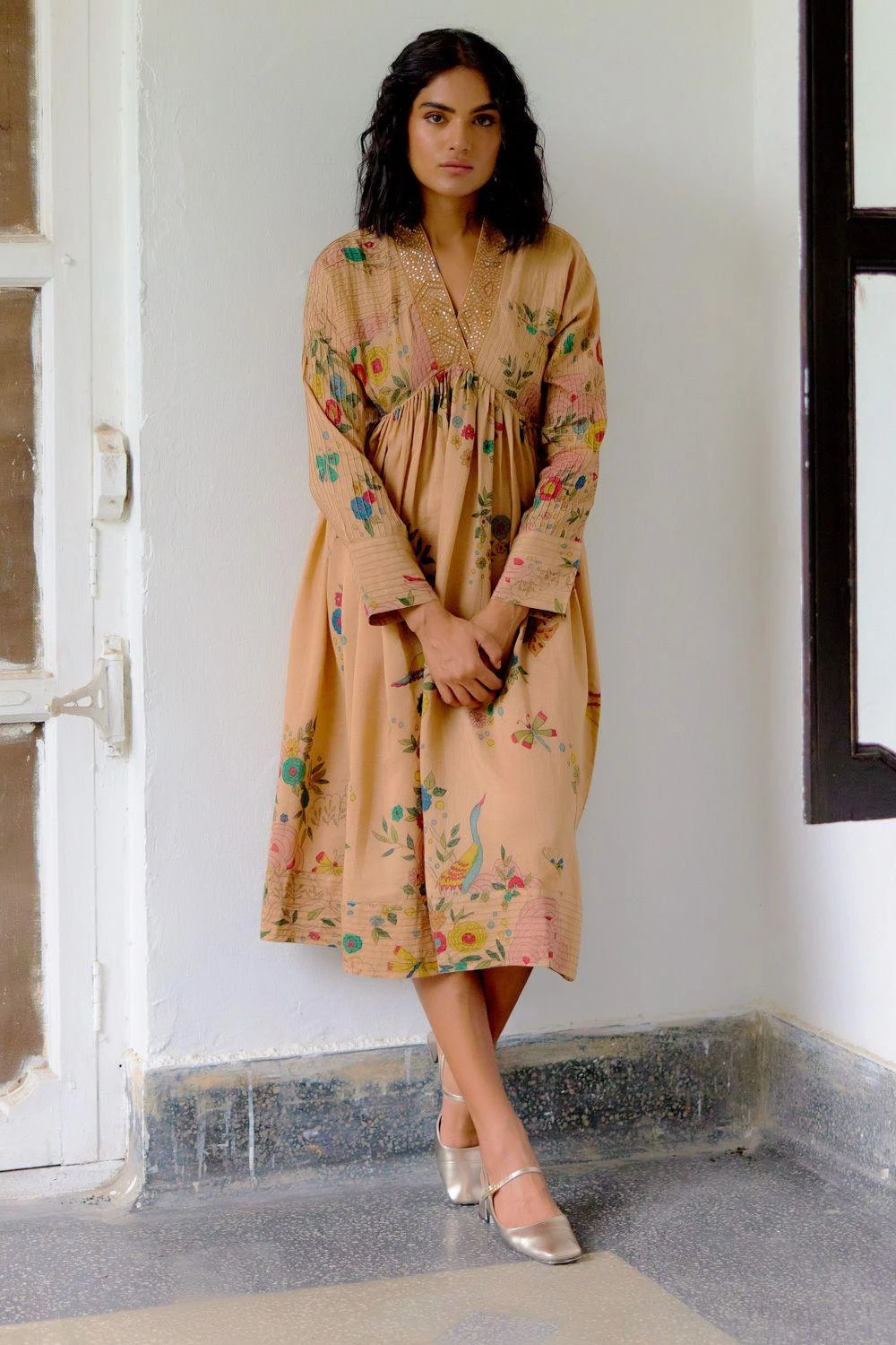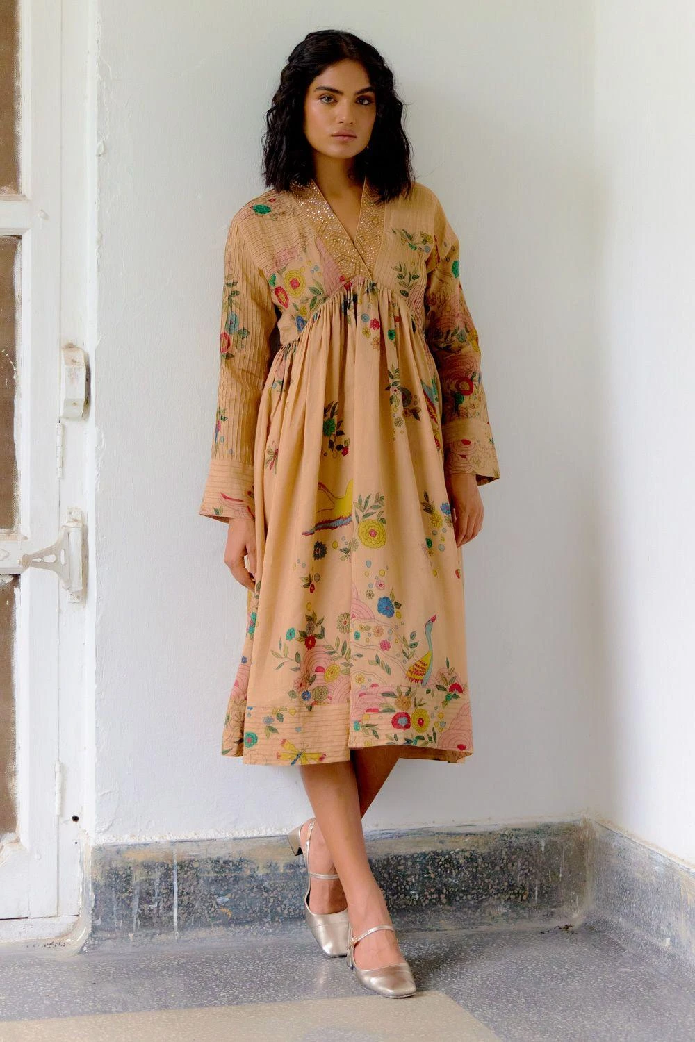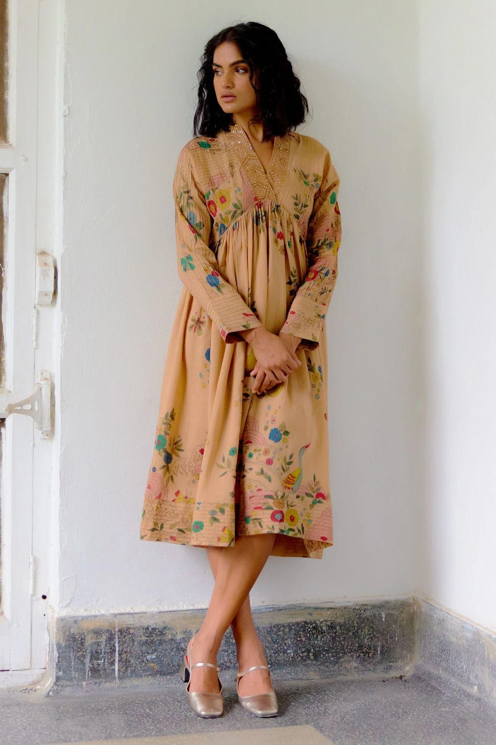 Adorn yourself in this exquisite dress, a masterpiece of hand-painted Kalamkari artistry and meticulous thread handwork. Designed with side pockets, box sleeves, and a relaxed fit for both elegance and comfort.