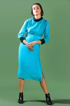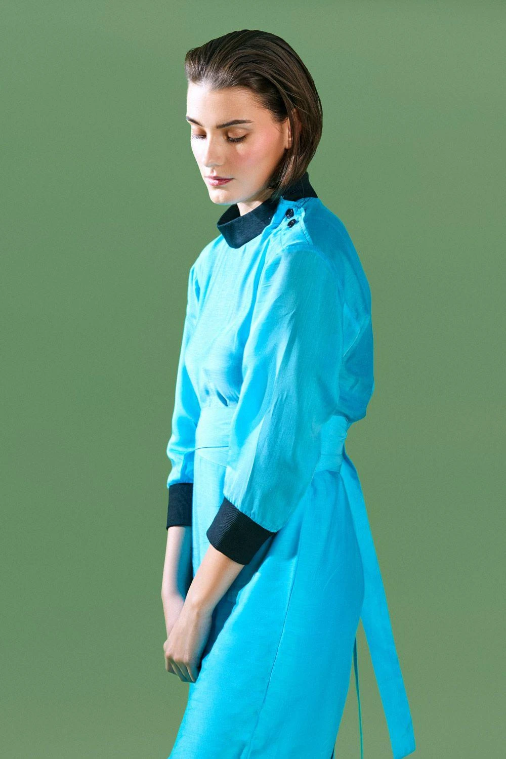 This vibrant blue dress is cut in soft chanderi fabric and topped off with black border details in ribbed cotton. This sweatshirt dress is minimalistic and has the right amount of style & comfort. Team it up with a pair of black pointed heels.
