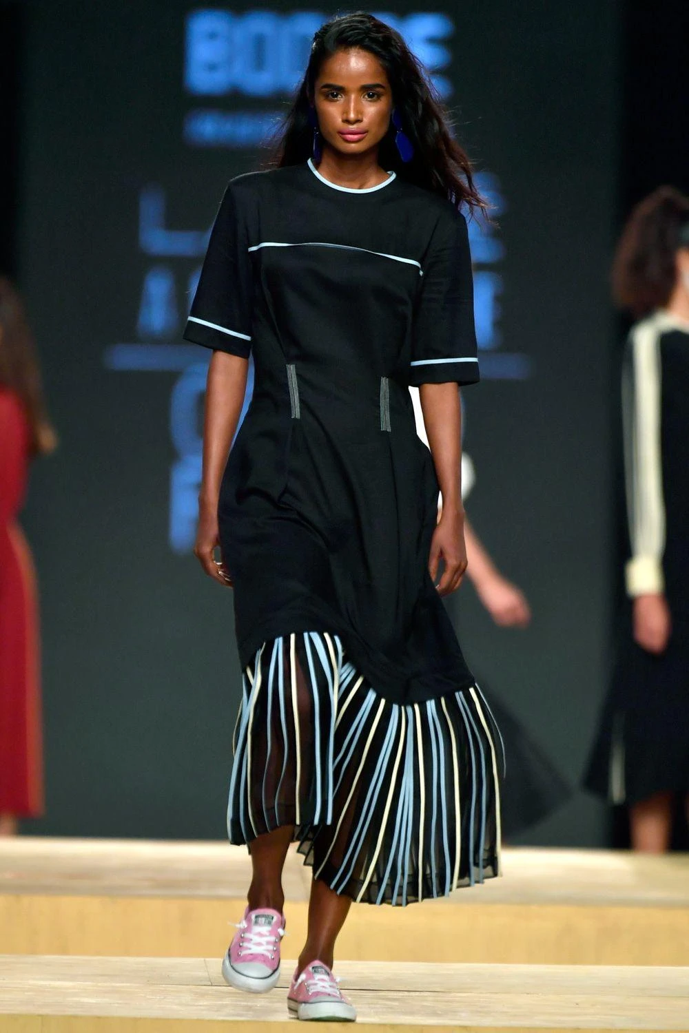 Make a chic style statement in this navy blue t-shirt dress. It is cut in 100% cotton modal fabric in a fit & flare silhouette with tucks at the waist & a flattering pleated organza hem. Style this look with a classic watch & a pair of heels.