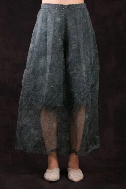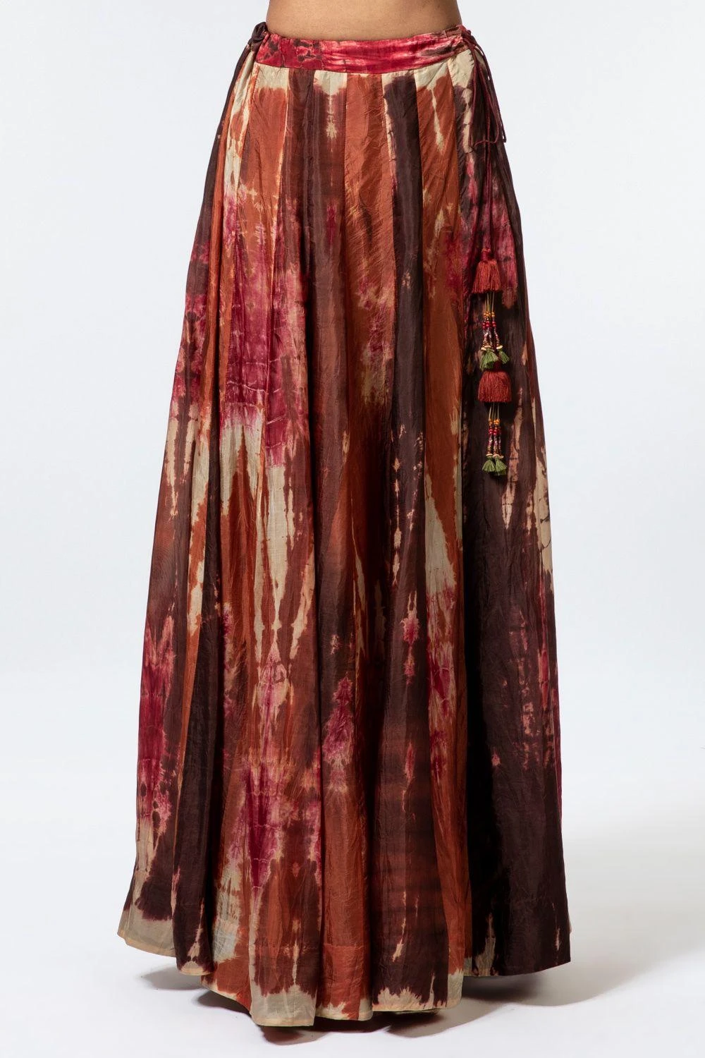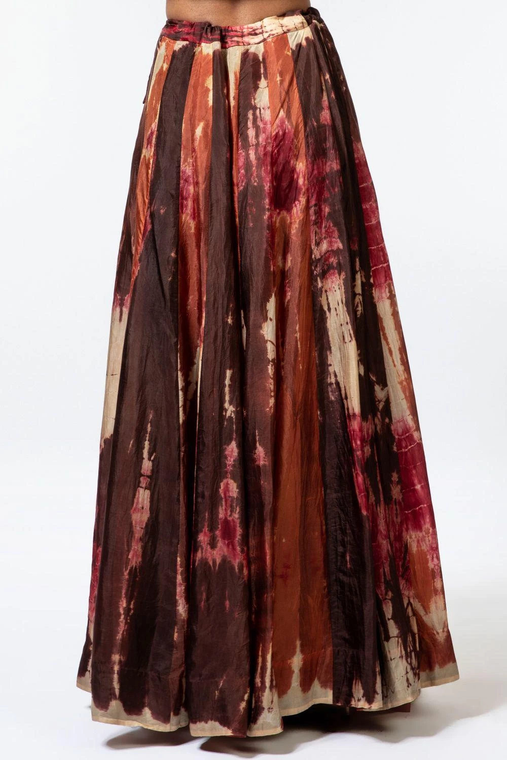 This panelled tie dye skirt is generously pleated in a silk tie dye fabric. This voluminous skirt is set in earthy tones, brown & maroon. Style it with a crop top or a short tunic.