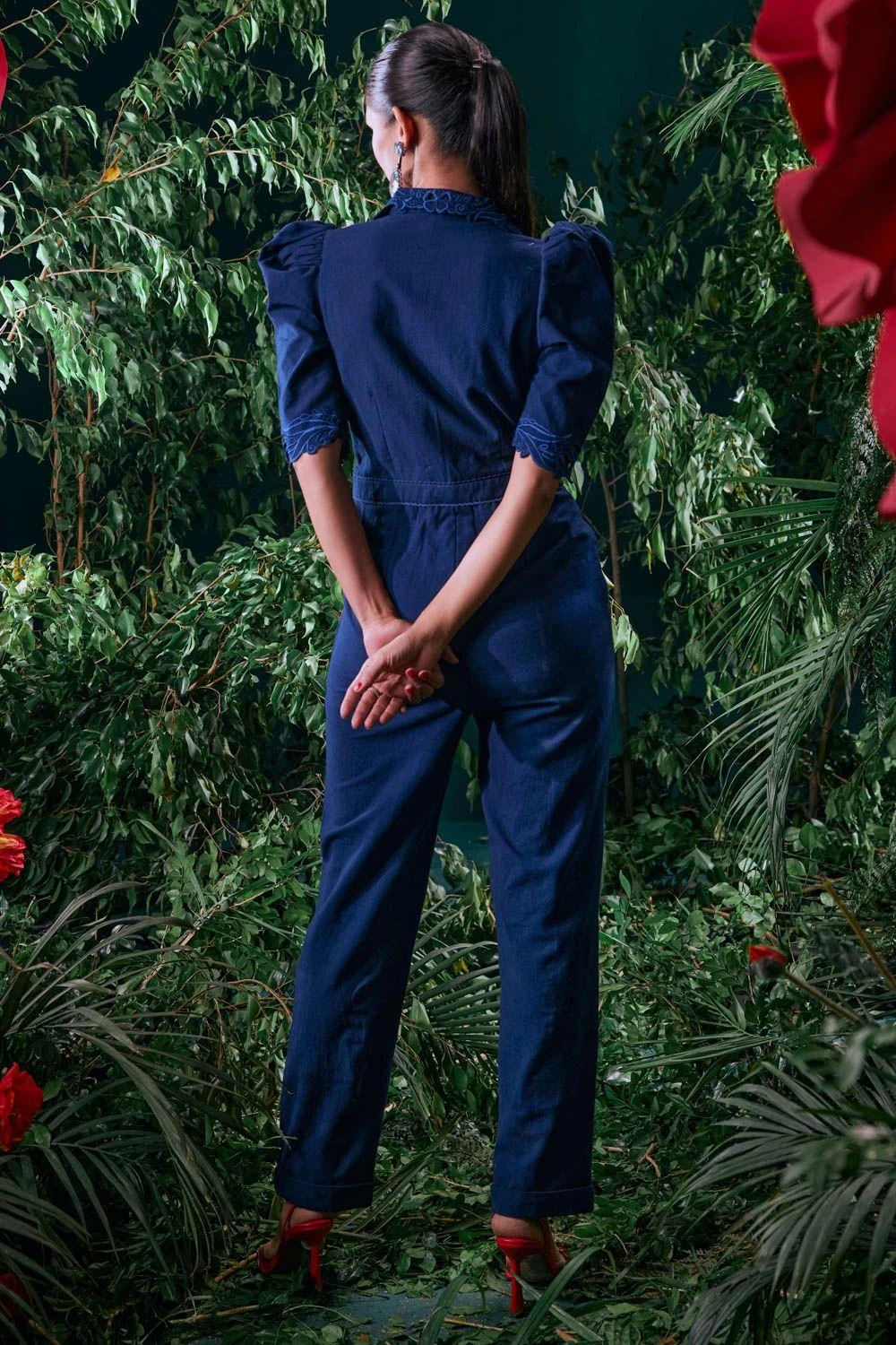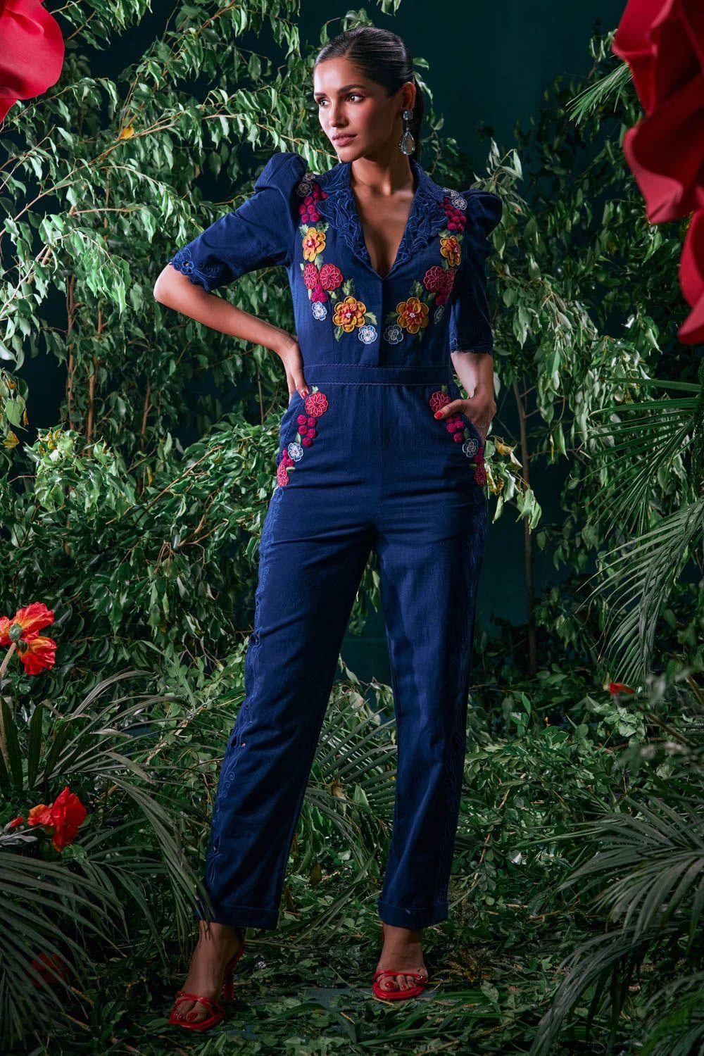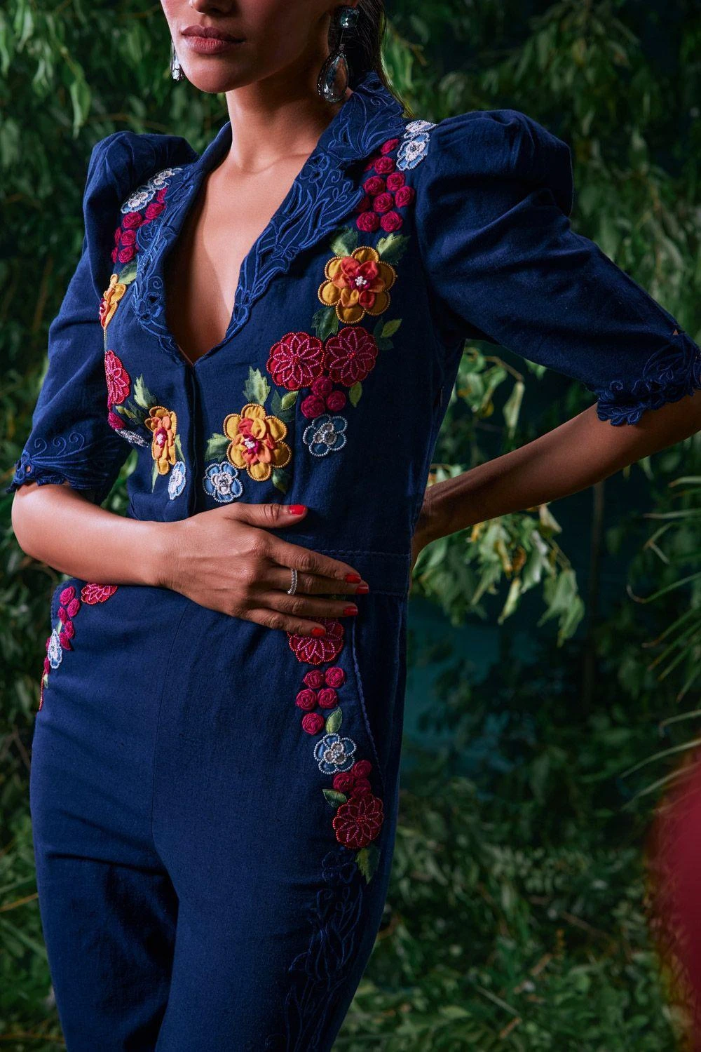 Step into timeless grace with this Indigo jumpsuit, lavishly adorned with intricate floral applique & exquisite cutwork. This ensemble beautifully melds artistry and contemporary elegance, redefining your unique statement.