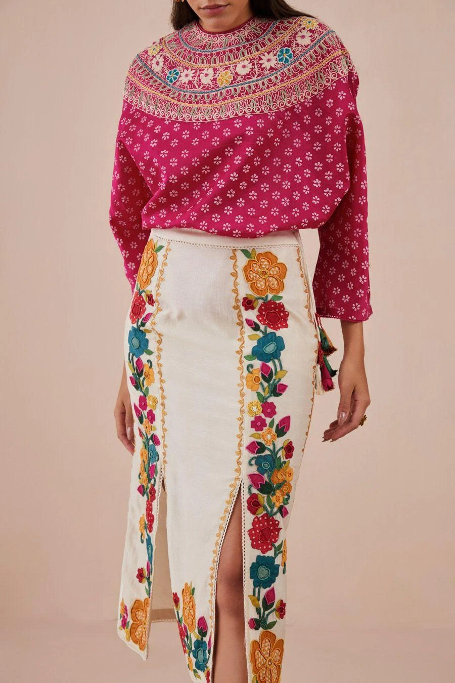 Add a layer of statement and glamour to your resort getaways with this ivory skirt. Crafted in chanderi, this ivory A-line skirt comes with front slits and applique and beadwork embroidered details.