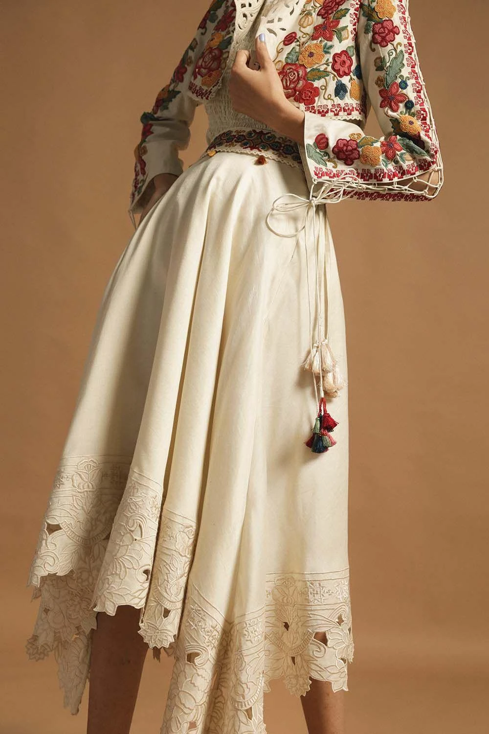 This asymmetric skirt in a beautiful ivory chanderi fabric features intricate cutwork along the hem and an embroidered belt, giving it an simple yet elegant look. Pair it with a top in any of the colours of the embroidery to complete the look.