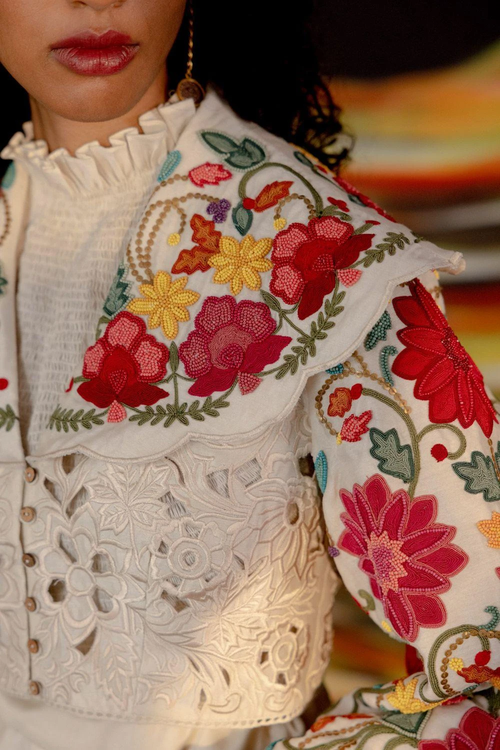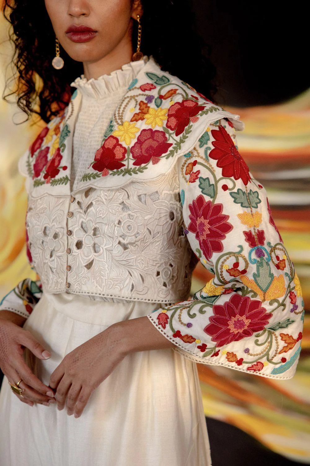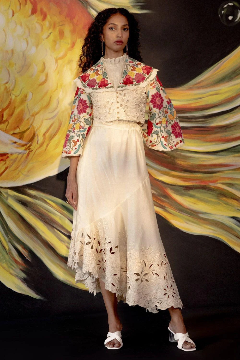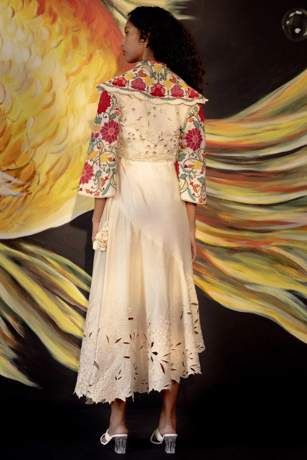Maximise the life of your wardrobe with this exquisite skirt. Crafted in chanderi, it features a floral cutwork detail & an asymmetric hem. Style it with an embroidered bustier and dainty jewellery to complete the look.