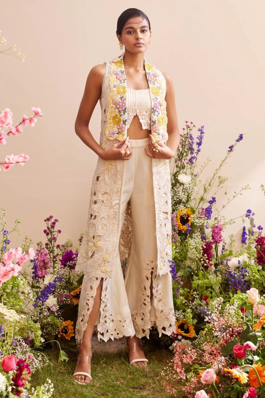 Crafted in chanderi, this ivory bustier has pleated straps & floral applique details. Style this piece with the Ivory cutwork bell bottom pants from the collection to complete the look.