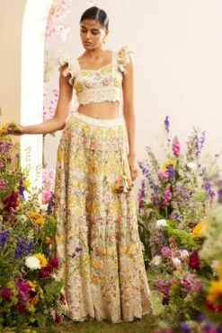 Maximise the life of your wardrobe with this bustier. Crafted in chanderi, this bustier features intricate beadwork details & ruffle sleeves. Pair it with the Ivory multi pastel cutwork lehenga from the collection for an effortless daytime look.
