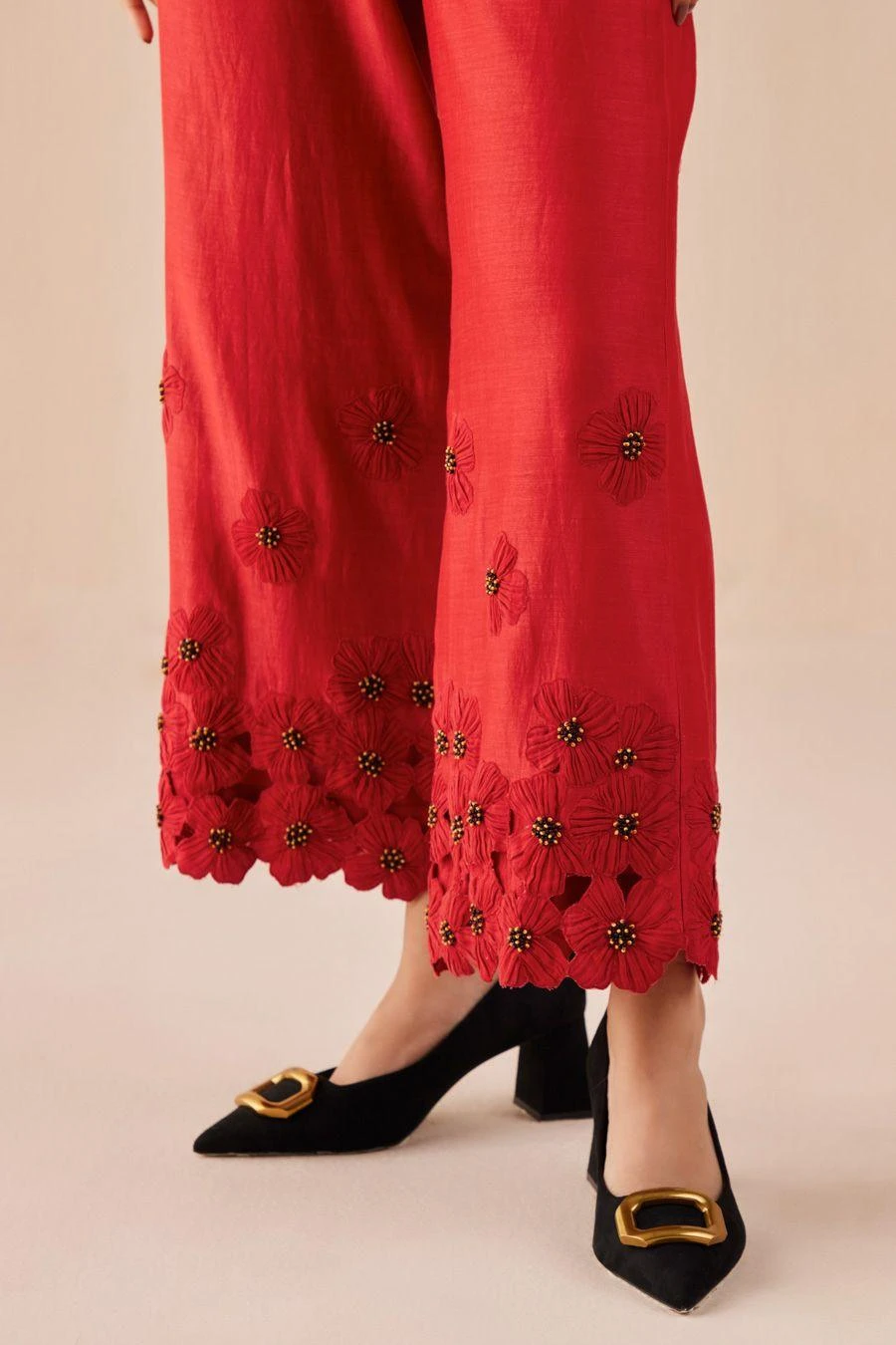 Maximise the life of your wardrobe with these exquisite pair of trousers. Crafted in chanderi, these straight poppy pants feature cutwork and beadwork details. Style it with the Red poppy applique shirt from the collection to complete the look.