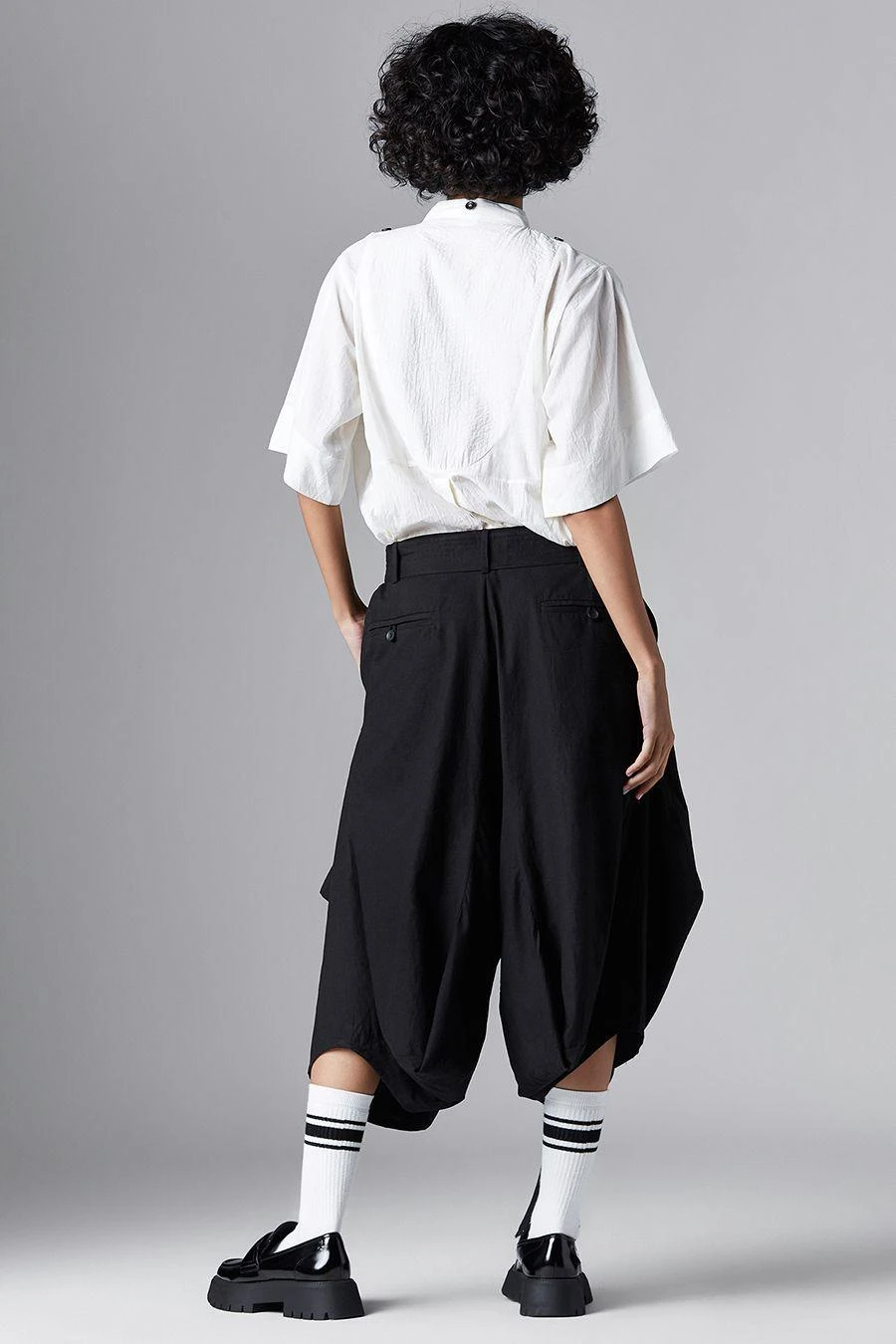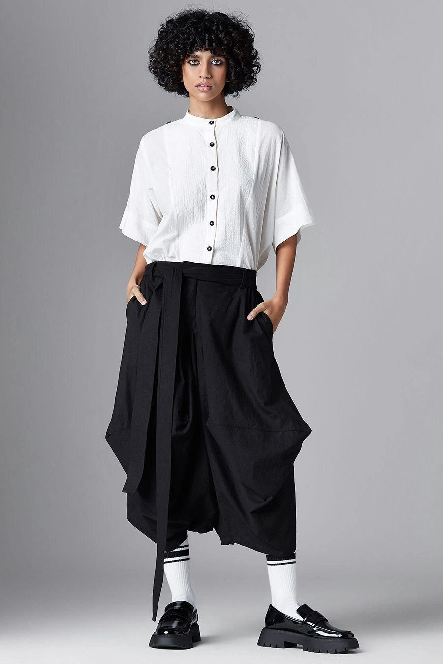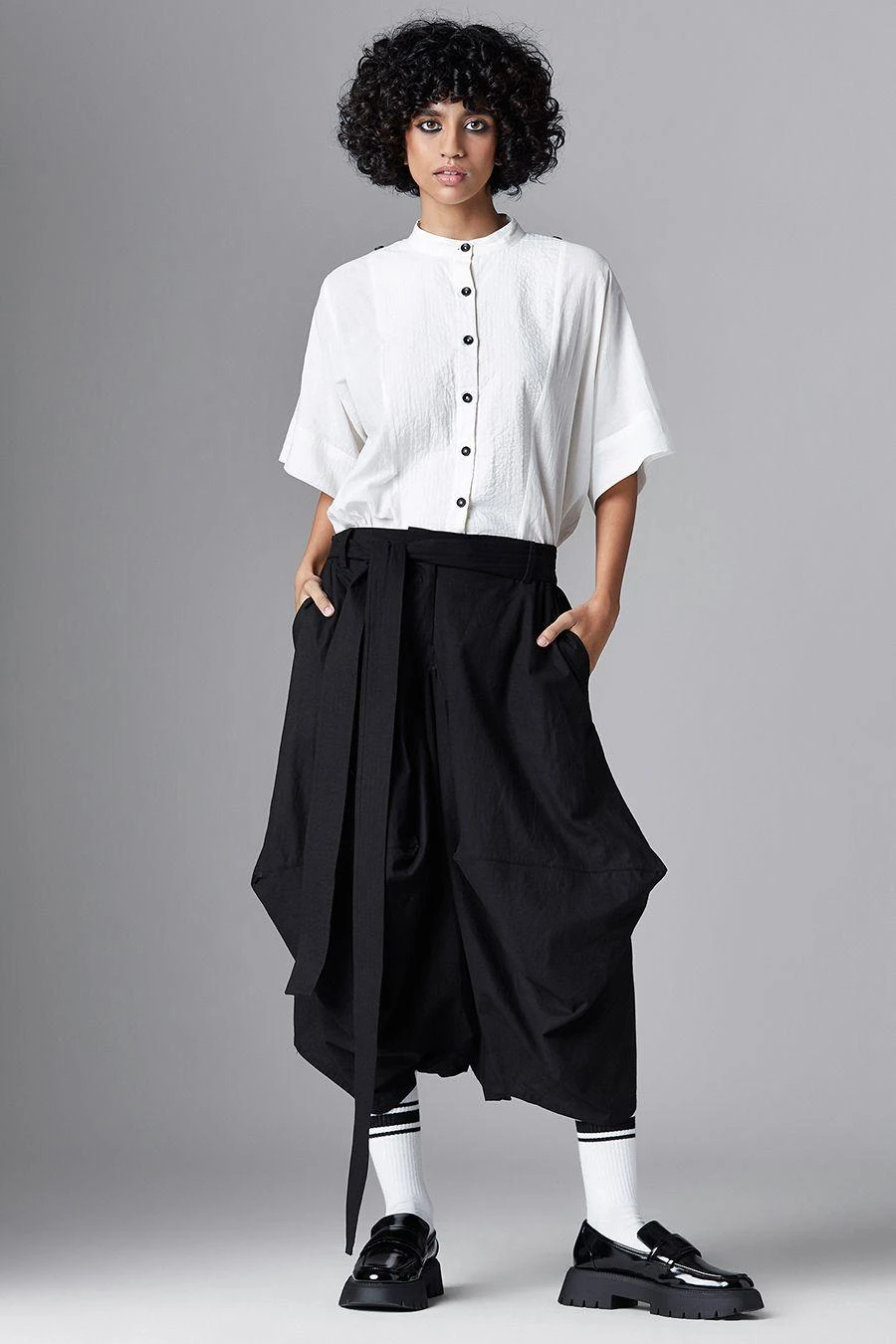 Experience the epitome of modern style with these dhoti trousers with a half side elasticated waistband. This piece effortlessly blends traditional design elements & contemporary fashion, making it perfect for any fashion-forward wardrobe.