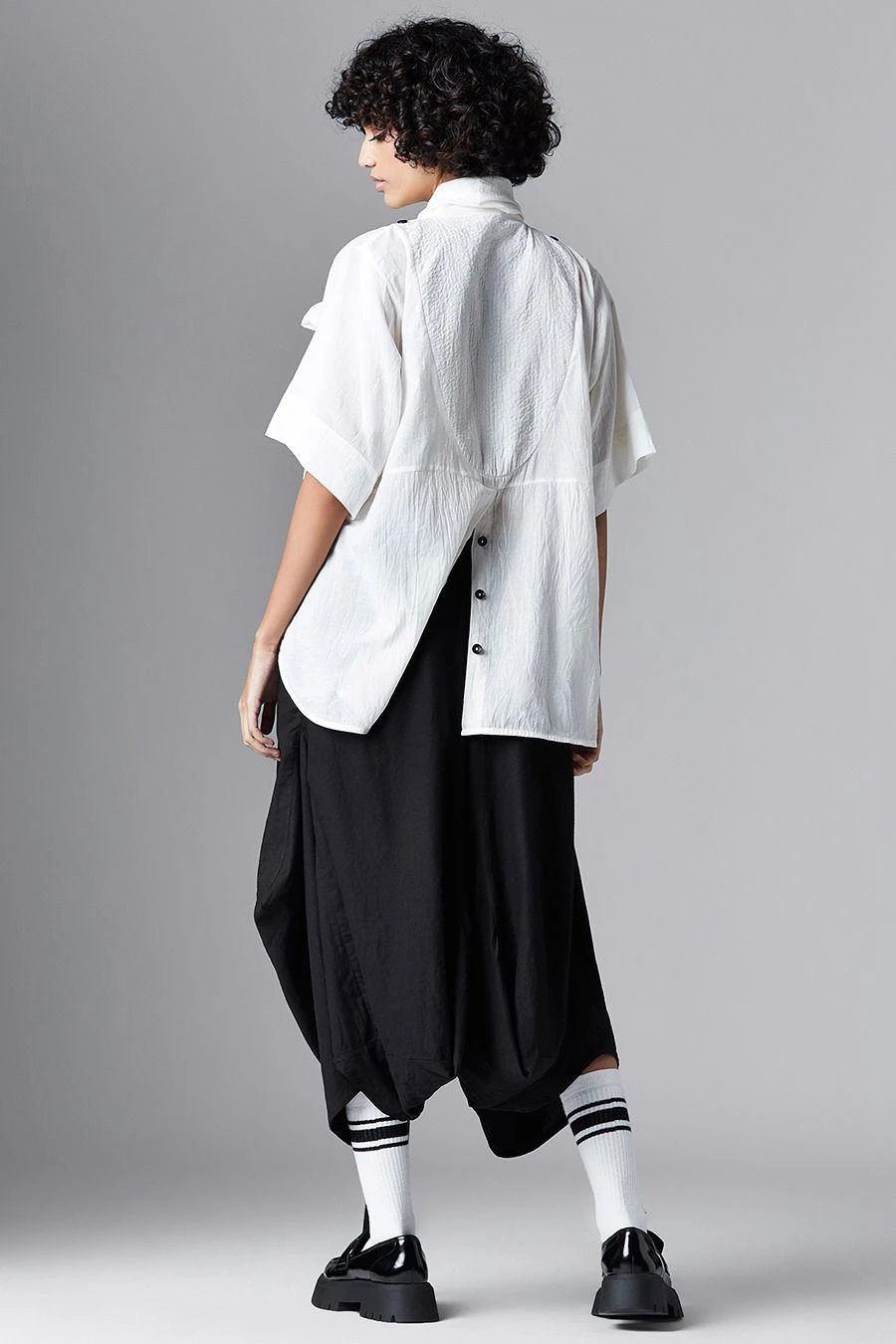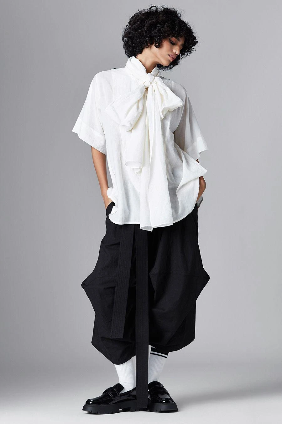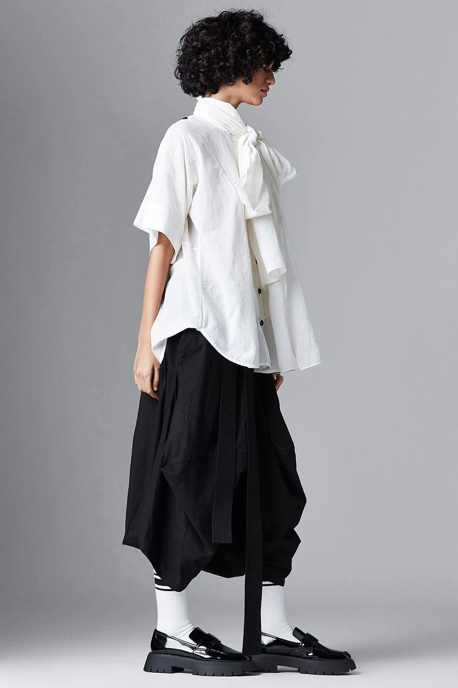 Make a statement with this captivating shirt featuring a U-shaped yoke, detachable scarf collar, & elegant half sleeves. This stunning piece is the epitome of modern sophistication, seamlessly blending classic design elements with contemporary flair.