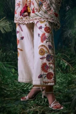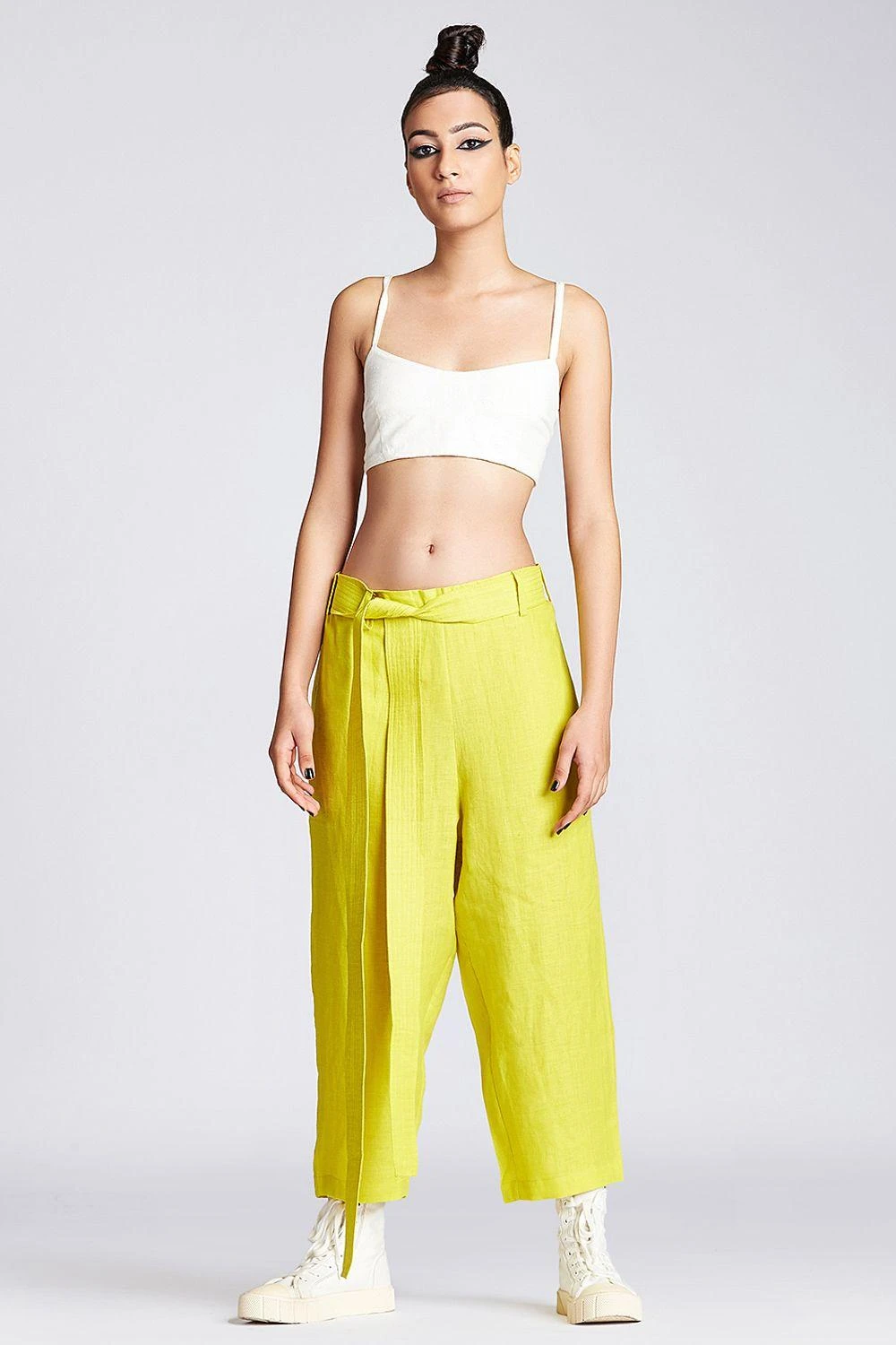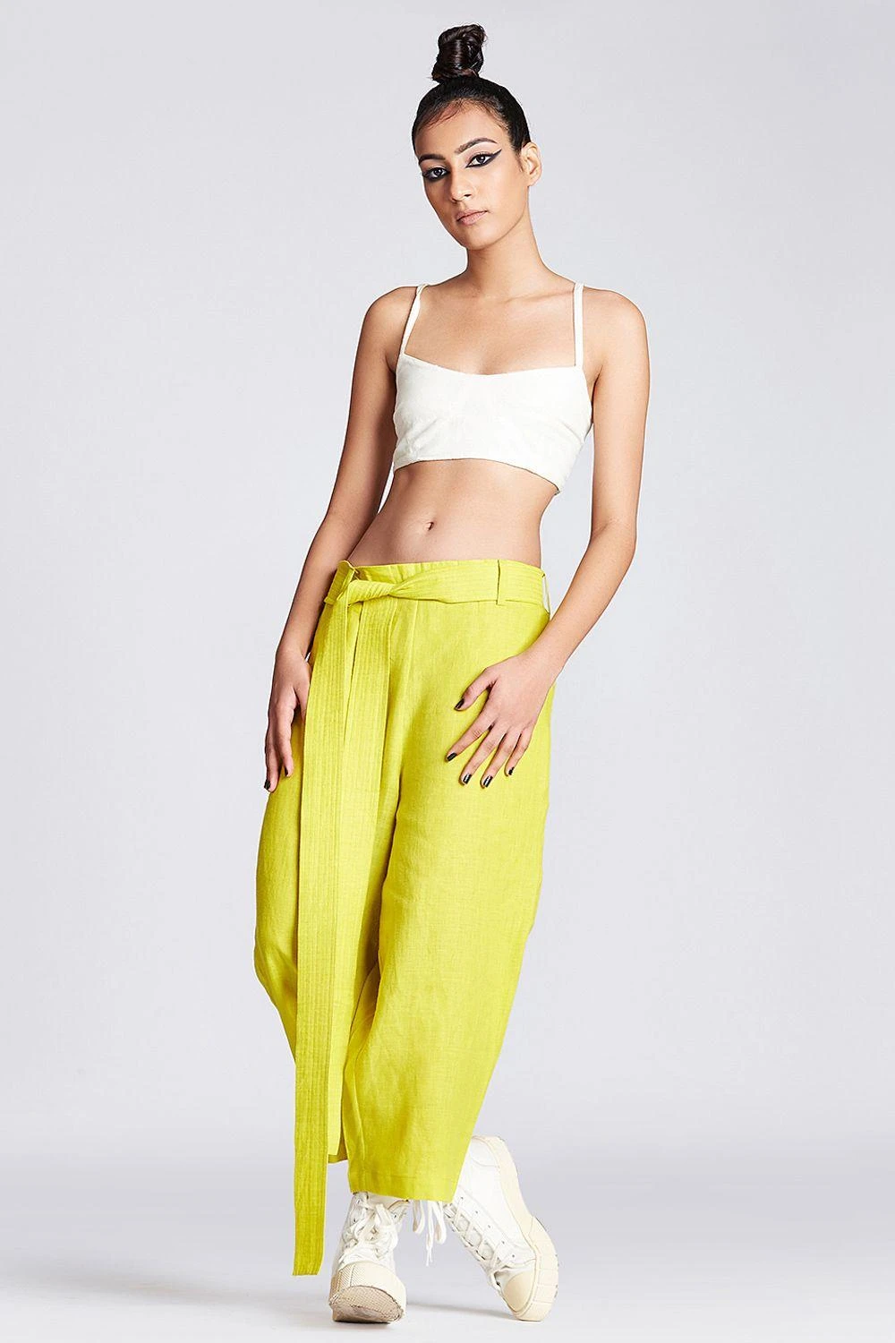 These pale yellow narrow pleated pants will make a high-rotating piece in your closet. These are cut in linen with front button placket and half elasticated waistband. It comes with a matching belt.