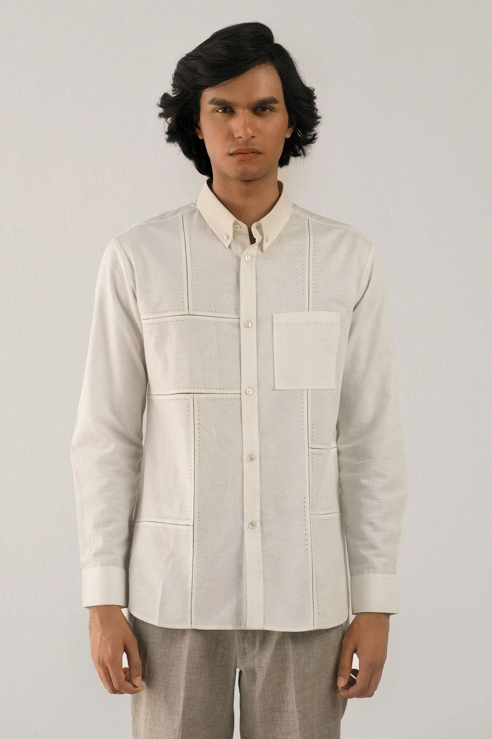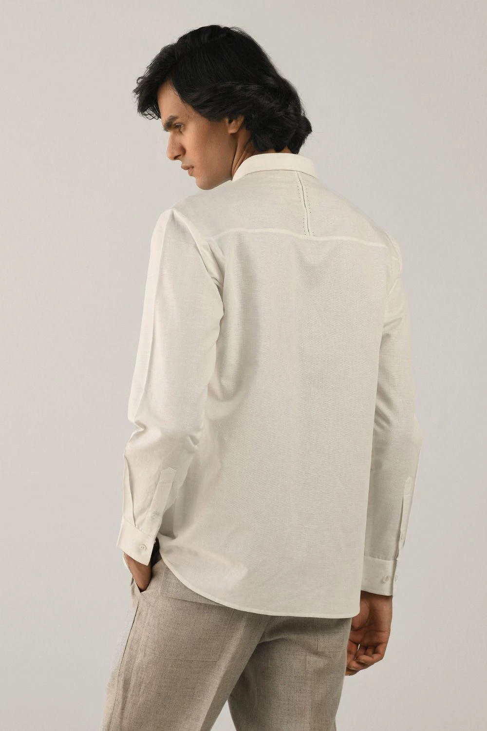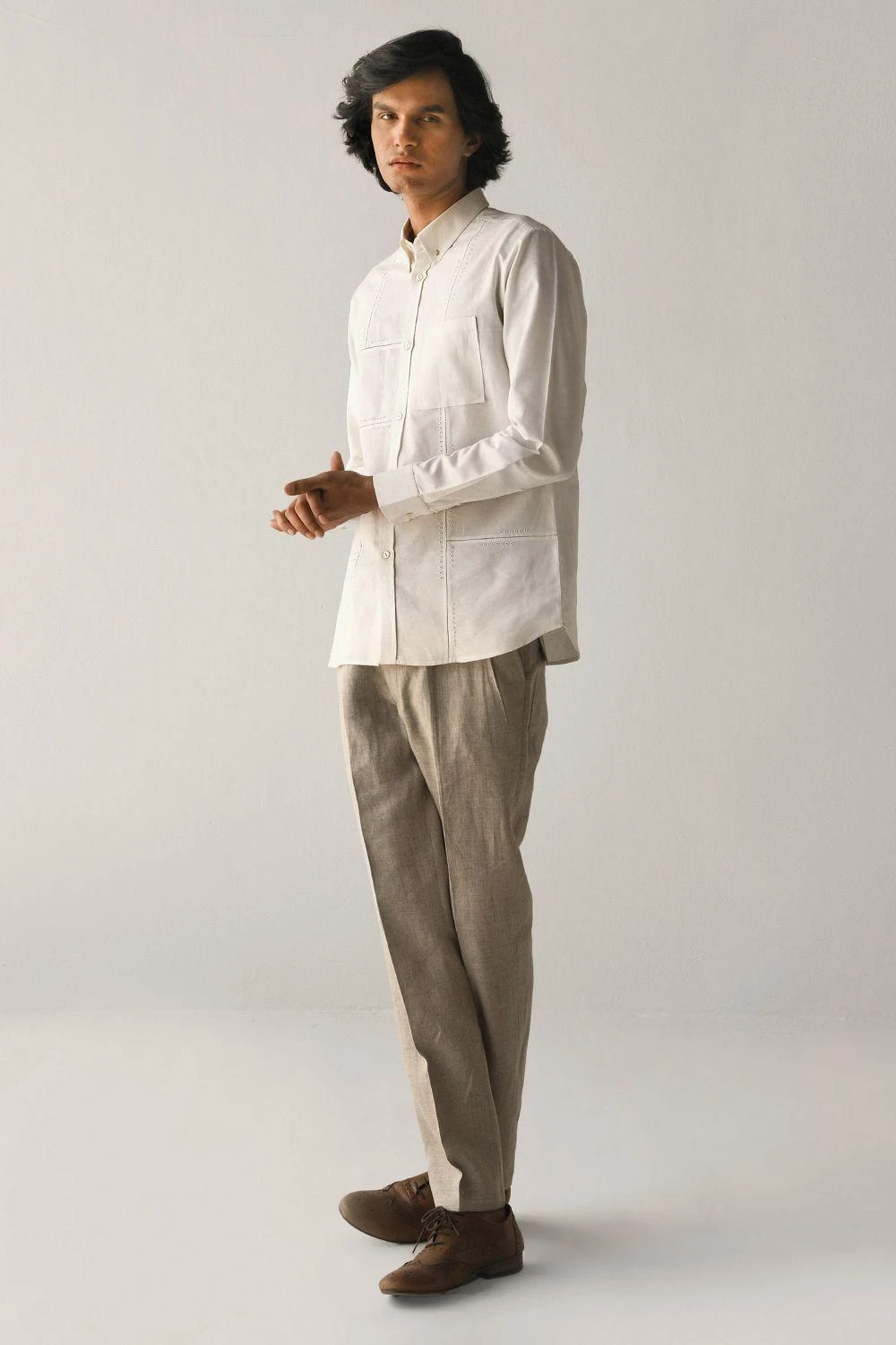 This ivory linen shirt is a wardrobe staple piece. It features two pockets and is uplifted with top stitch detailing all over. Style it with a pair of taupe pants for a modish contemporary look.