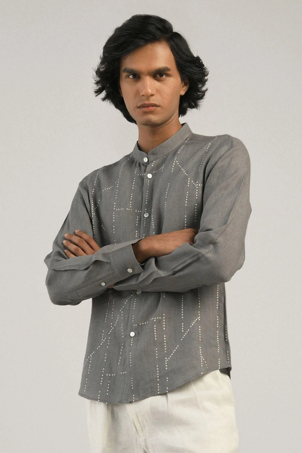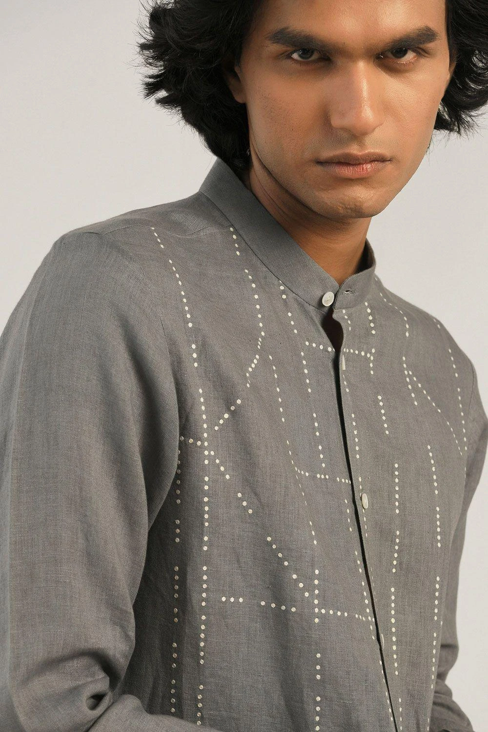 Switch your mainstream shirts with designer & one of a kind pieces from Countrymade. Featuring this smoke grey shirt woven in breathable linen fabric. It features fuselage dots embroidery all over the shirt.