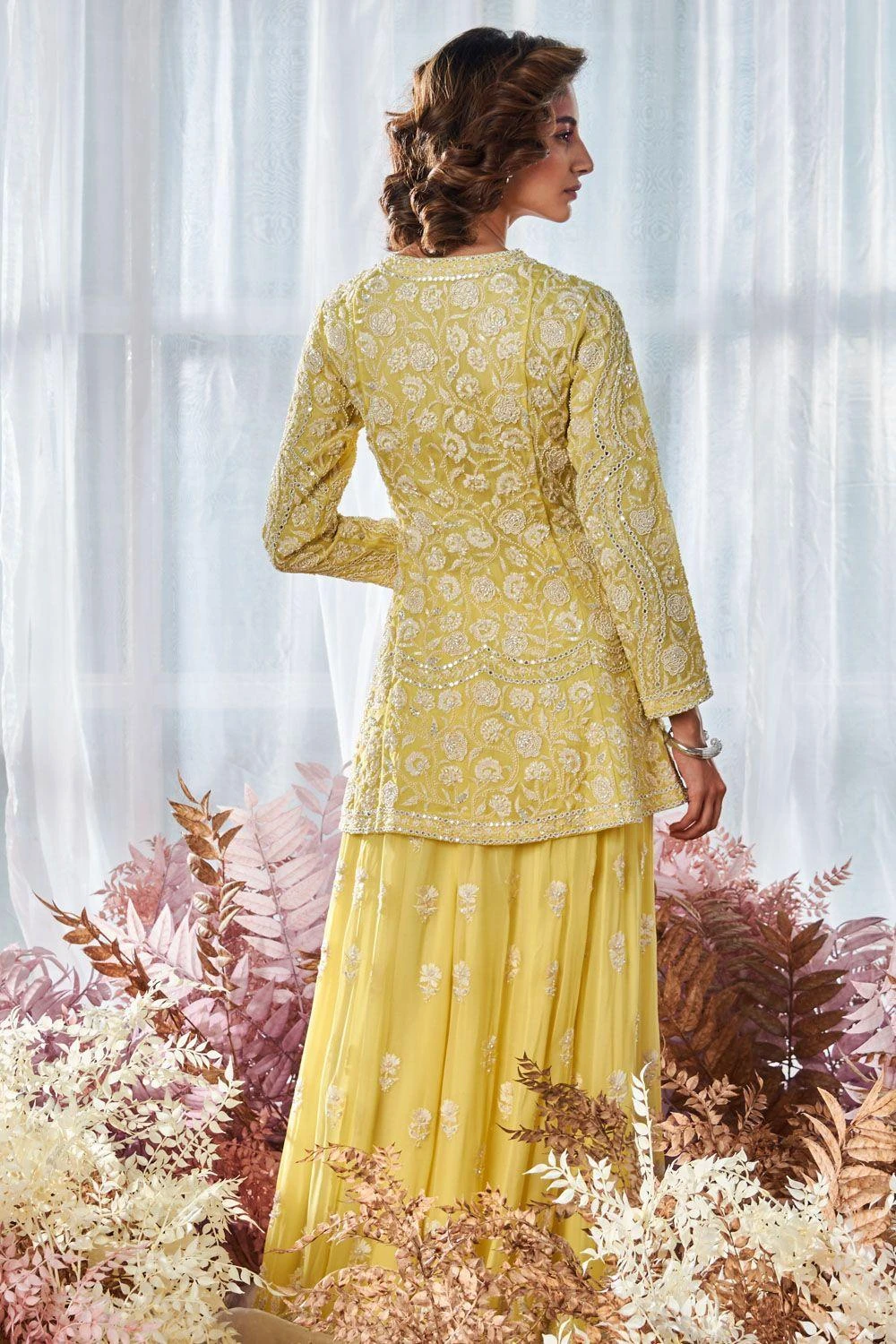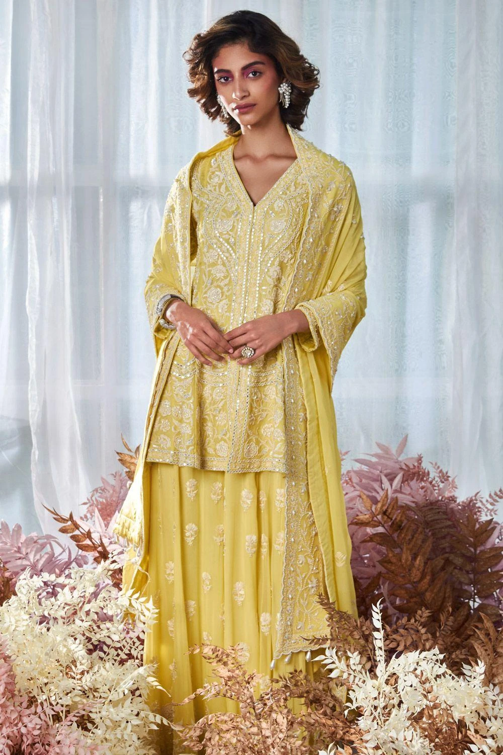 This elegant yellow sharara set is perfect for daytime wedding festivities. The set is intricately embroidered with threadwork & sequins details. Style this timeless piece with statement chandbalis and a clutch to complete the look.