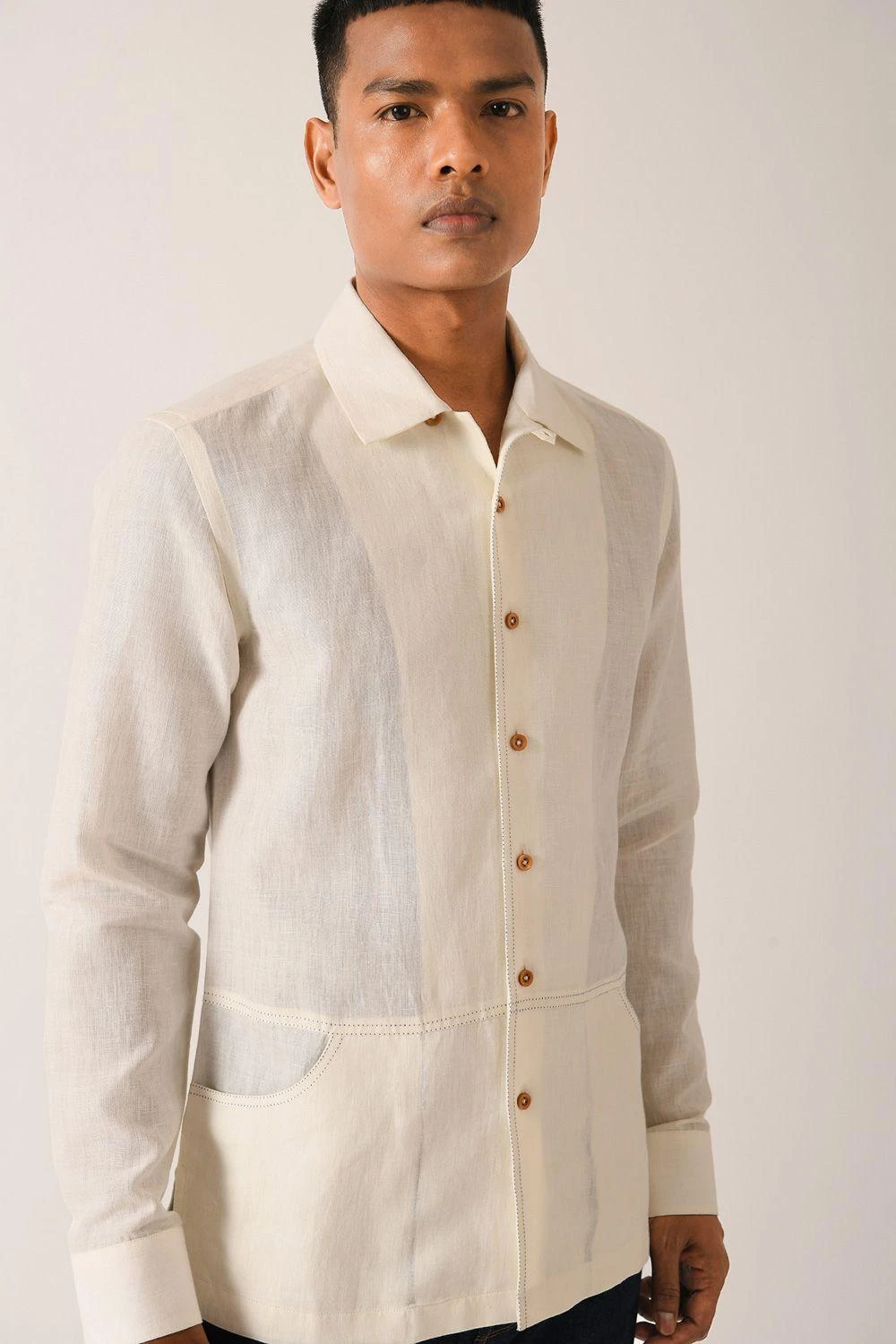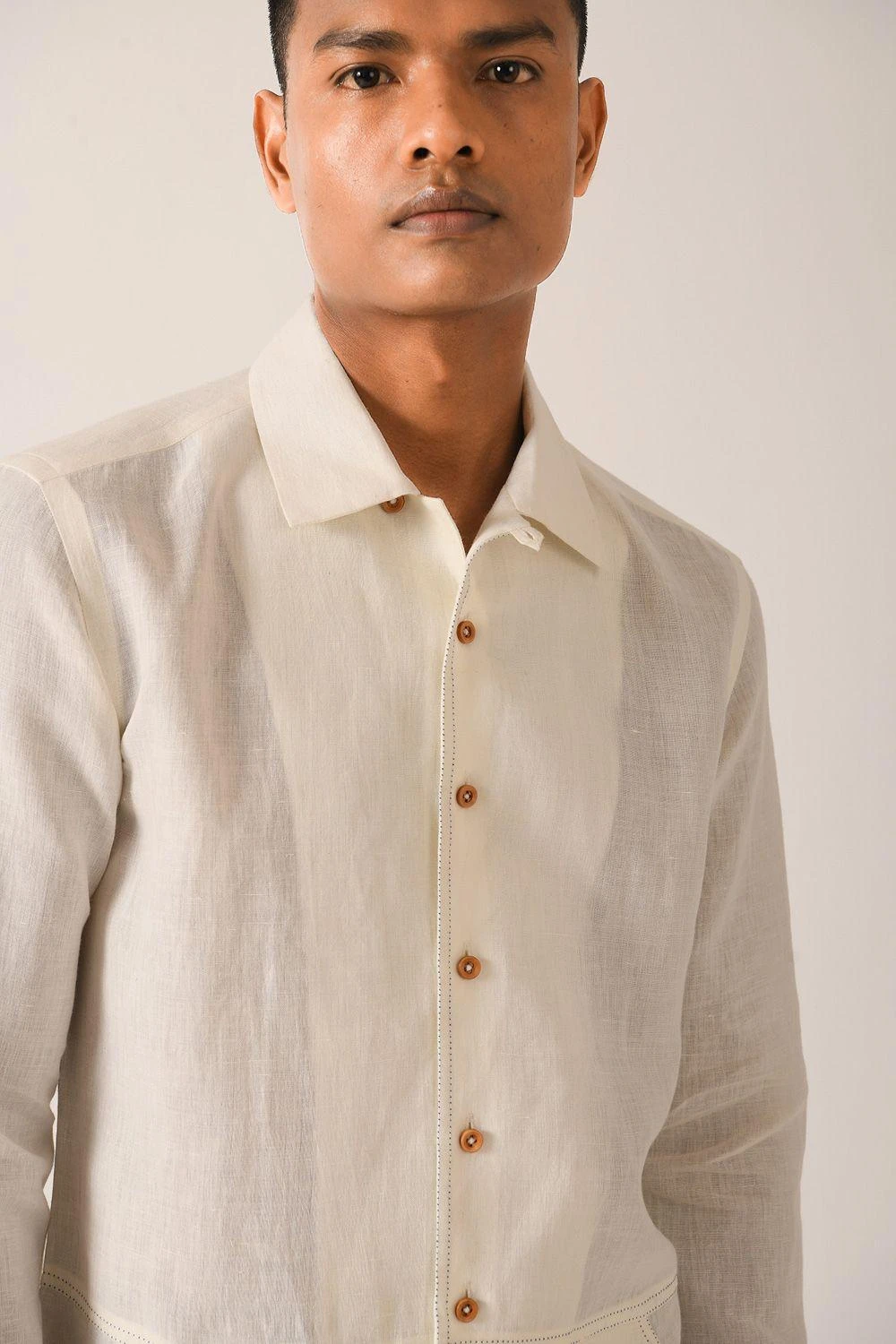 This classic cream shirt can be worn from day to evening effortlessly. It is cut in handloom cotton with stitch lines and features two side pockets, adding character to this piece.
