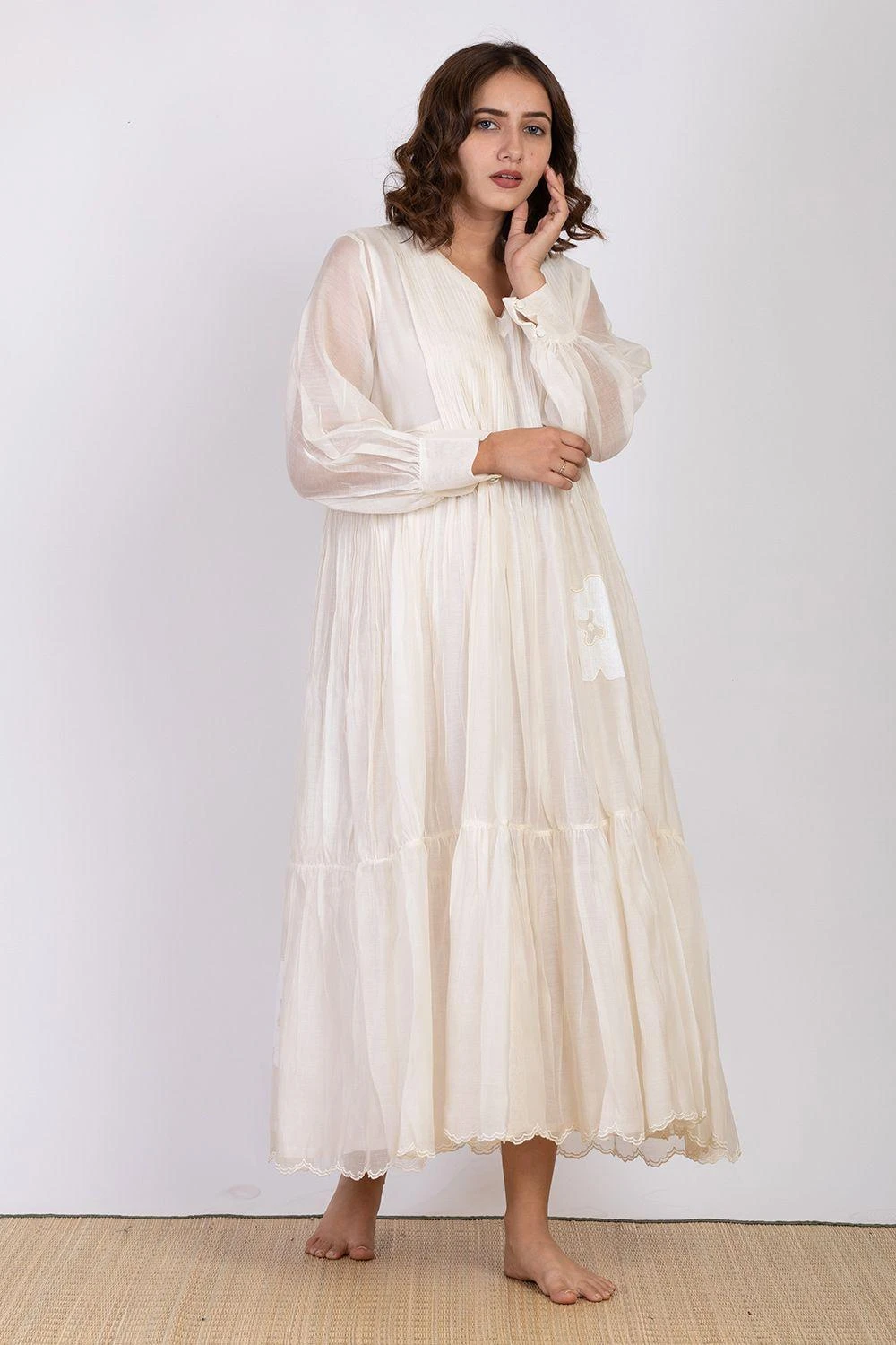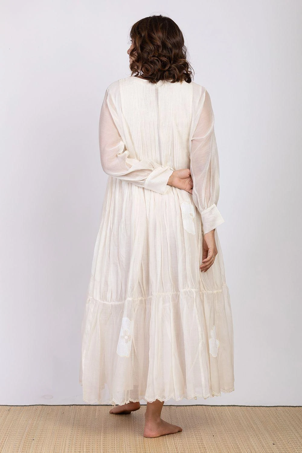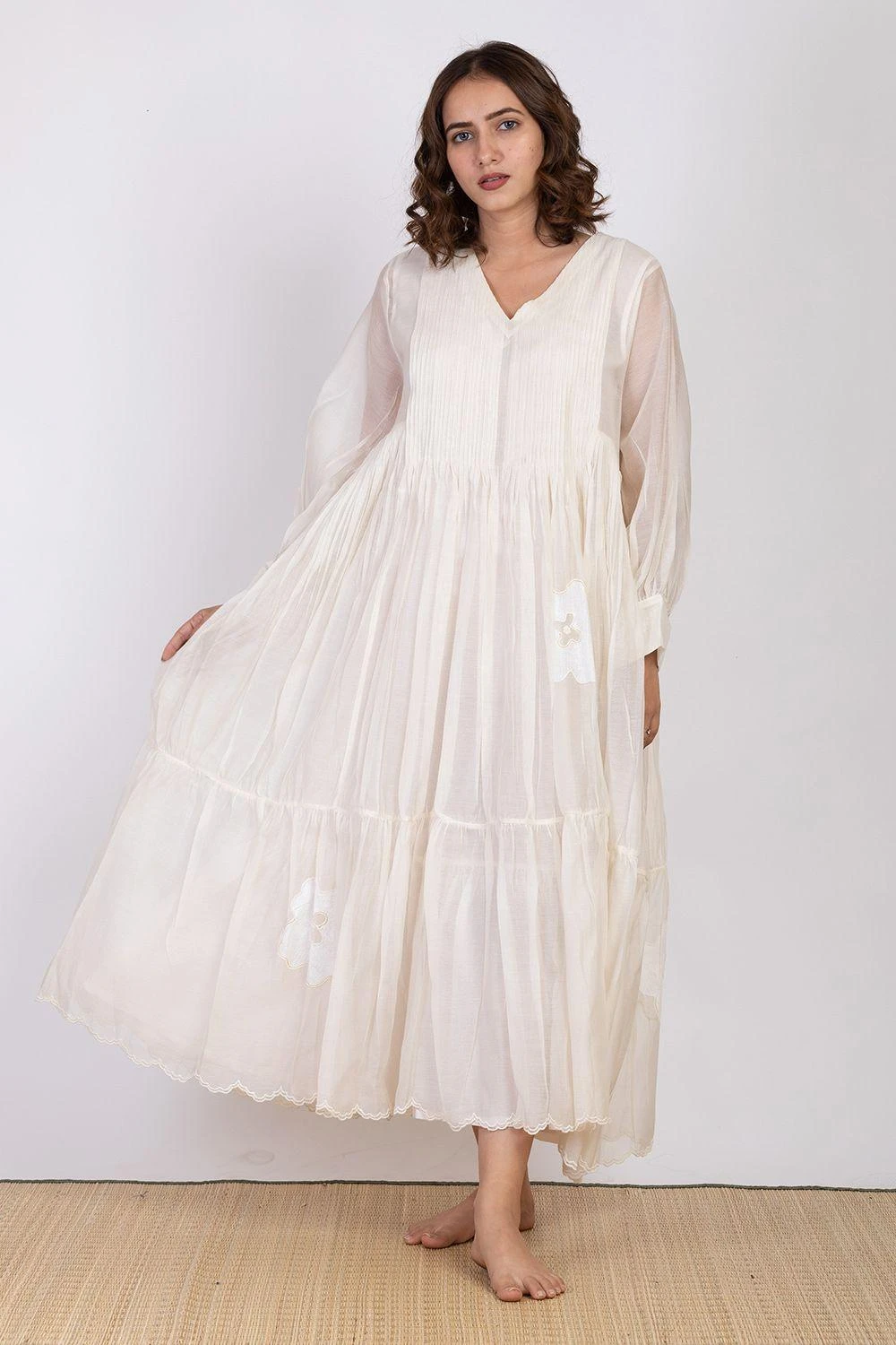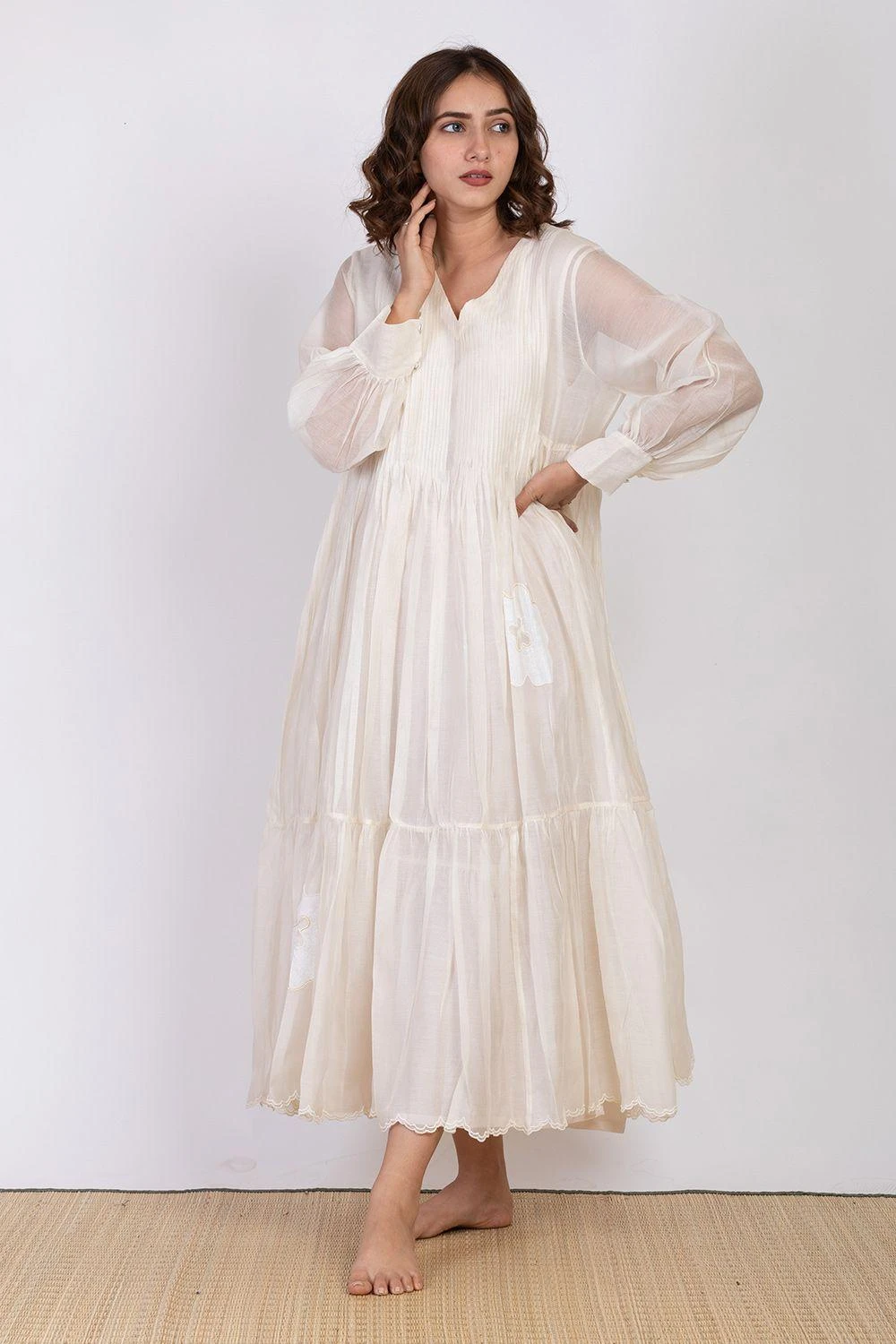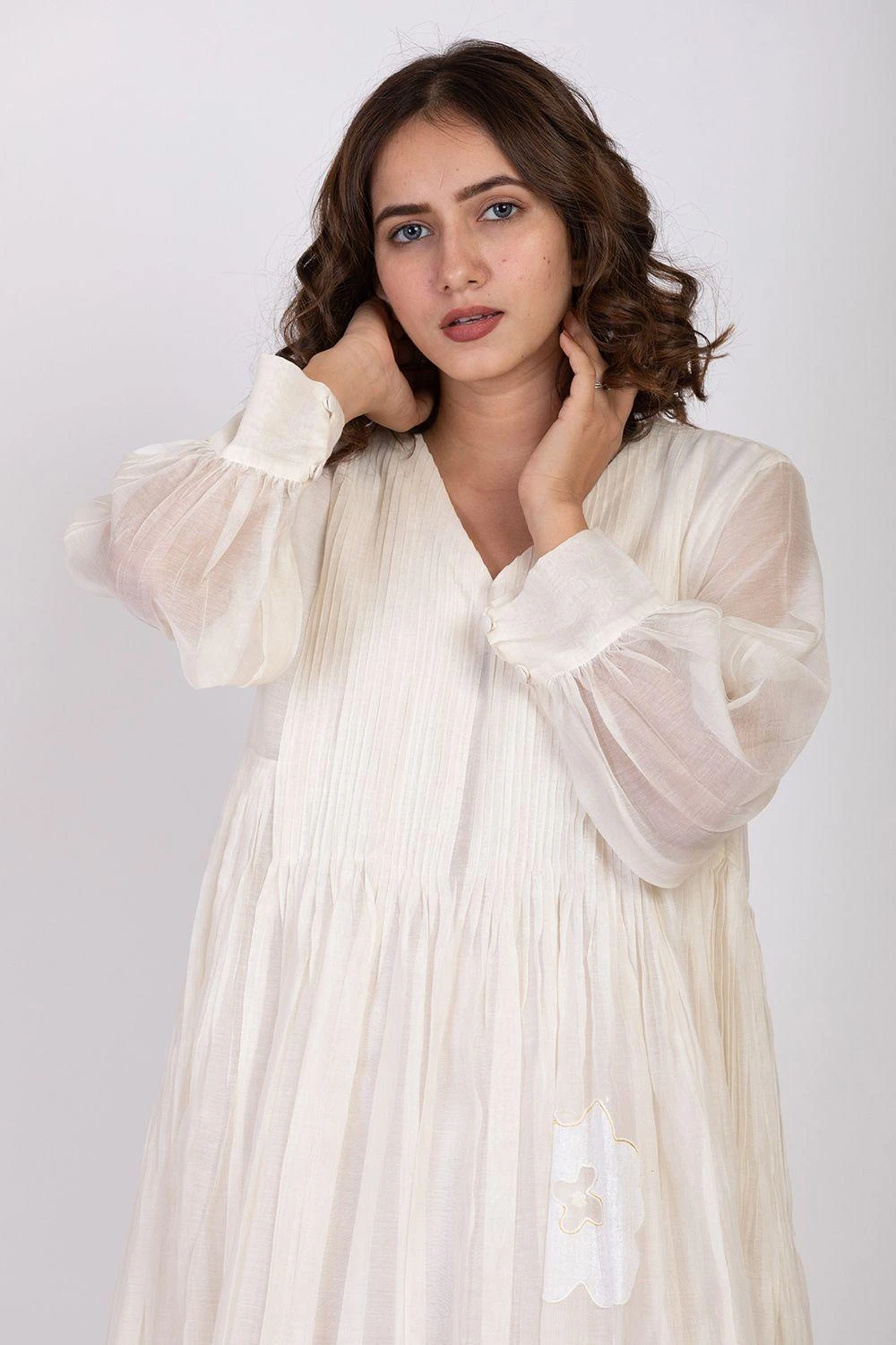 Maximise the life of your wardrobe with this roomy dress. Crafted in chanderi silk, it features dainty floral embroidery pleats, intricate scallop cutwork at the hem & an inner slip. Style this tunic with oxidised jewellery to complete the look.