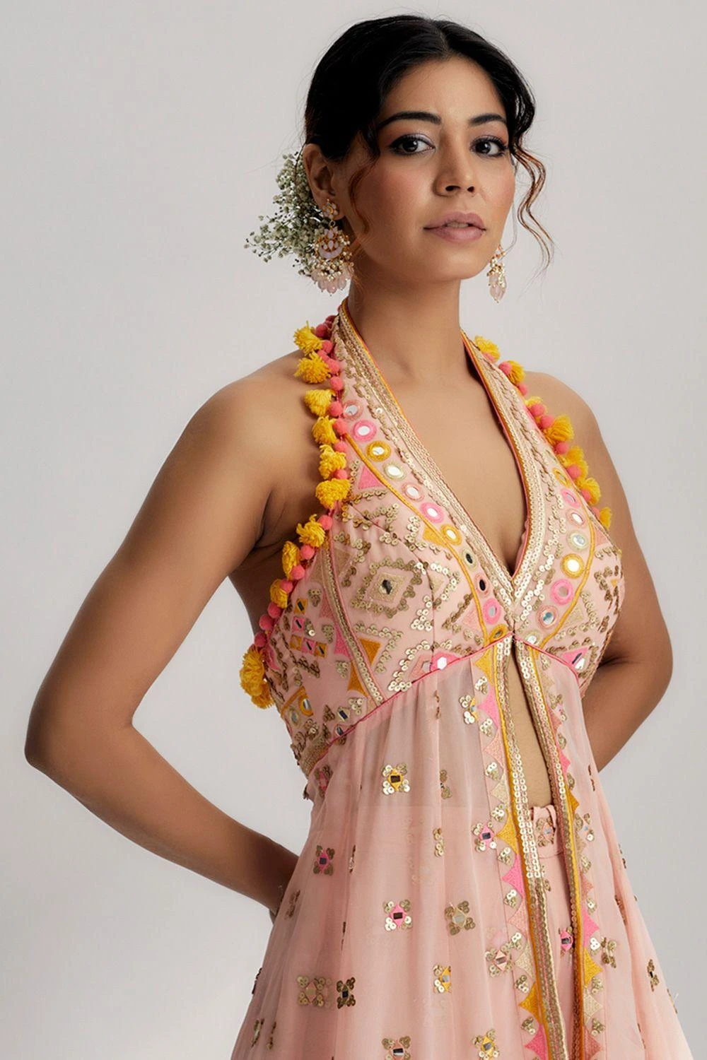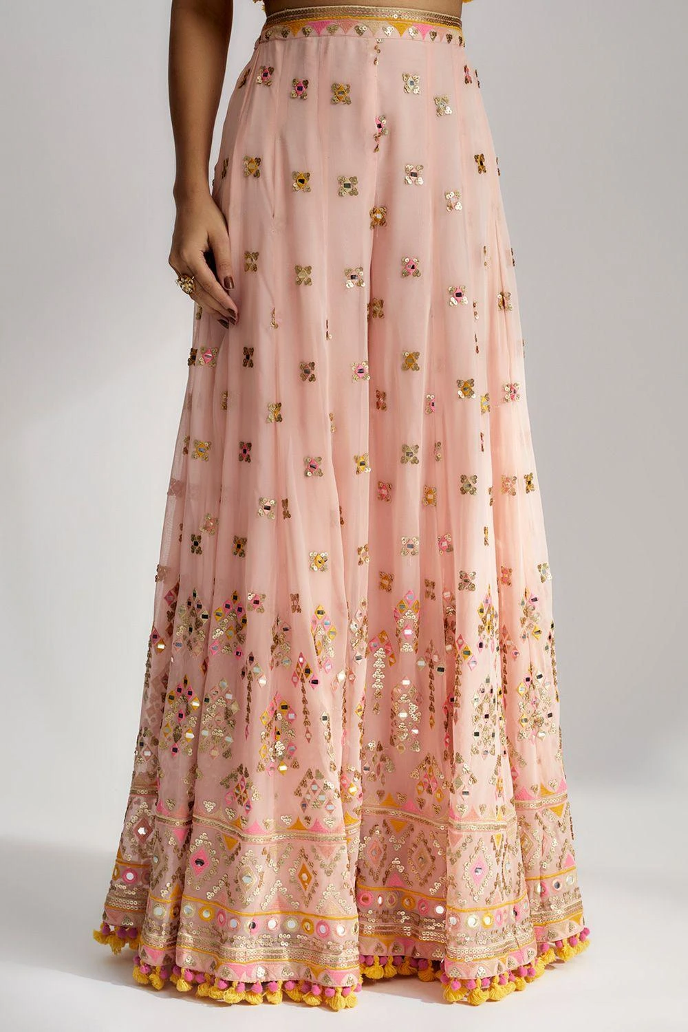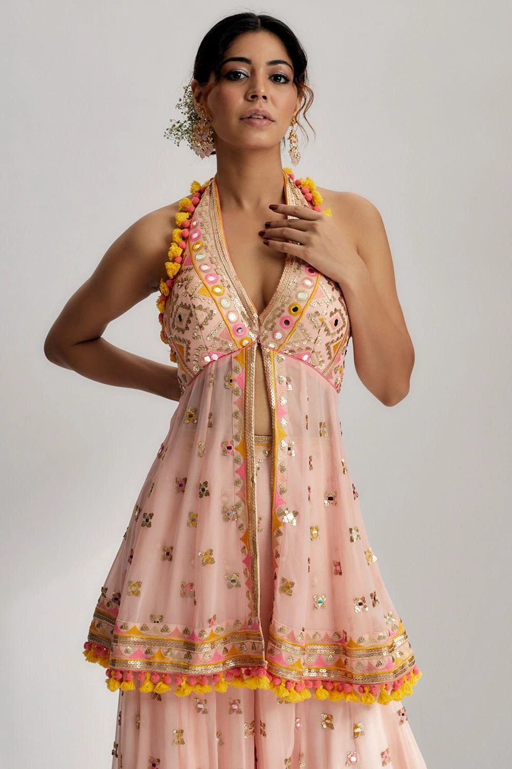 The Aarini Flared Pant Set seamlessly merges traditional charm with contemporary style. Tassels & intricate embroidery add opulence, while strategically placed tassels bring movement and flair.