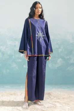This navy panelled top falls in the realm of luxe minimalism. Crafted in cotton silk chanderi, it features handcut applique & cutwork details paired with a slip. Style it with the Ivory cotton satin cutwork pants from the collection.