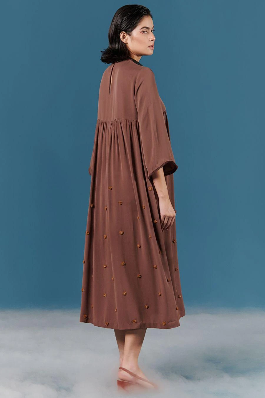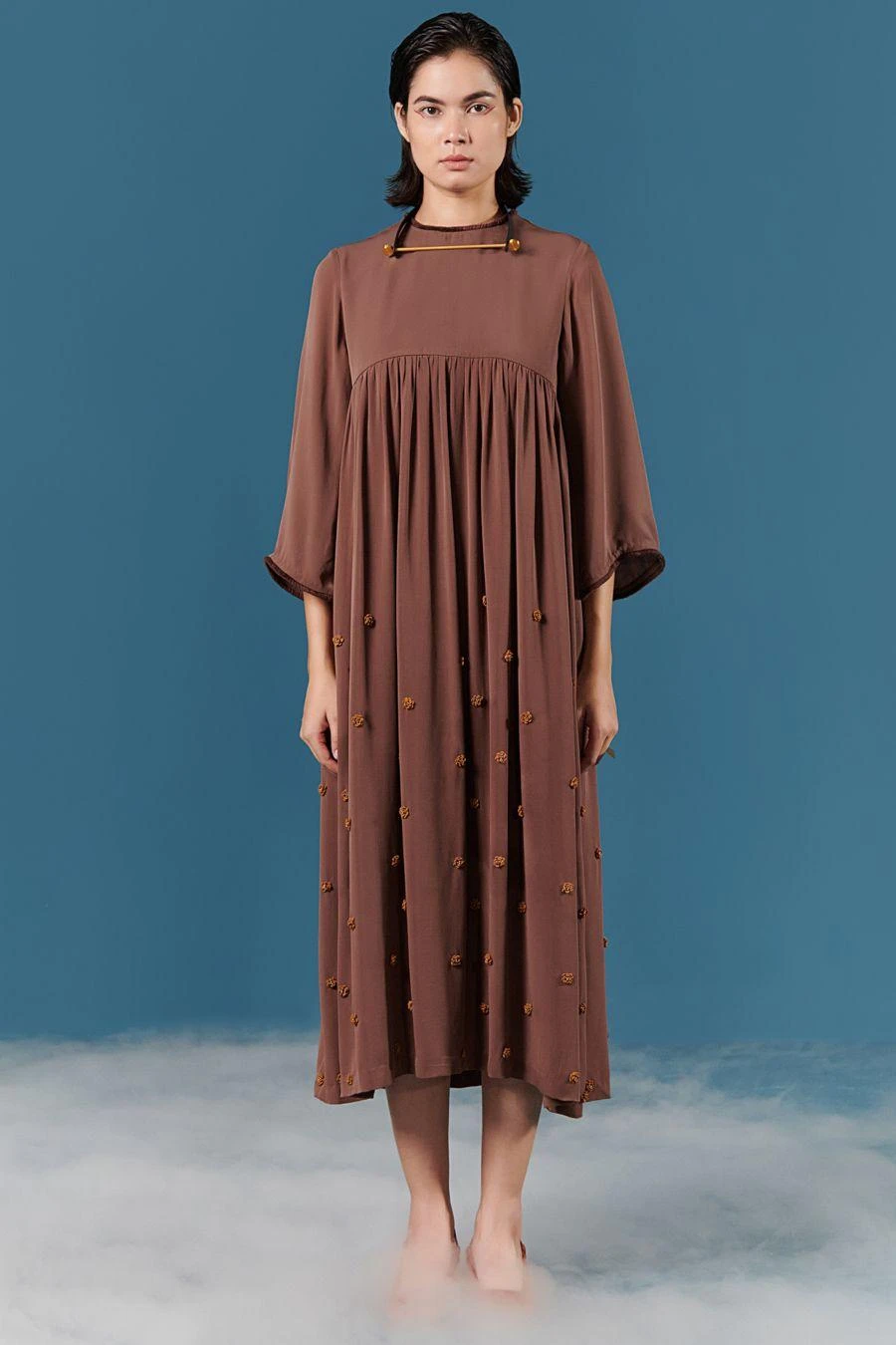 This bronze dress wonderfully fuses a minimal and feminine aesthetic. Crafted in georgette, this hand embroidered dress features beaded & sequinned detail with a floral embroidered yoke. Add a pair of dangler earrings to complete the look.