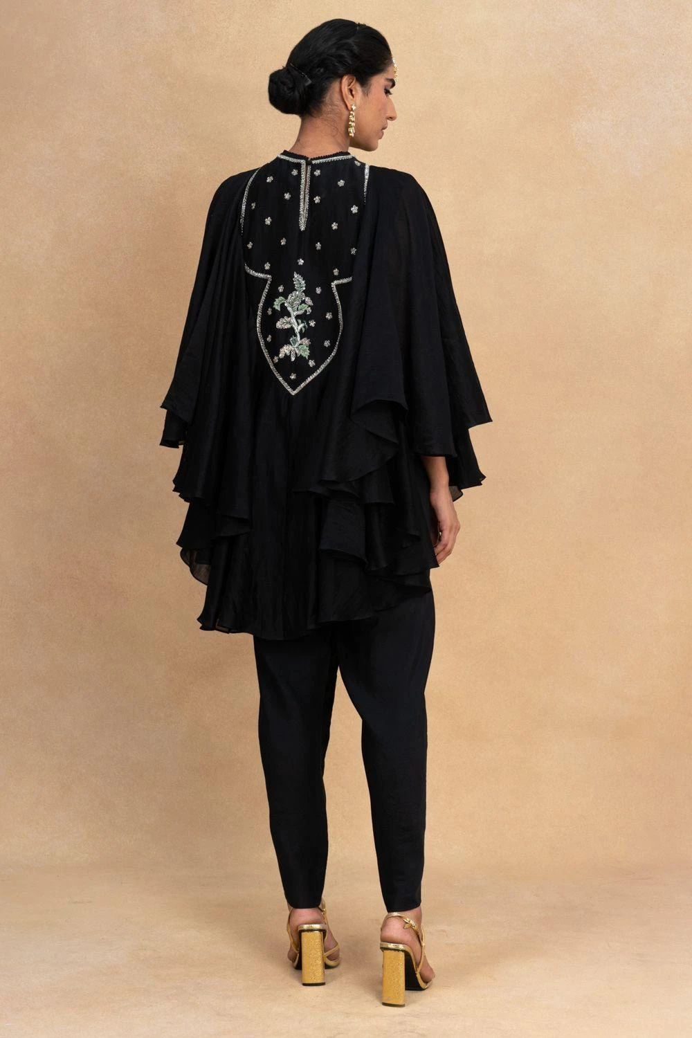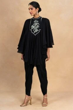 Look effortlessly stylish in this peplum top. Crafted in silk, this top features an embroidered yoke and dramatic sleeves. The embroidery gives it that wow factor and it can be styled with a lehenga, dhoti pants or a trouser.