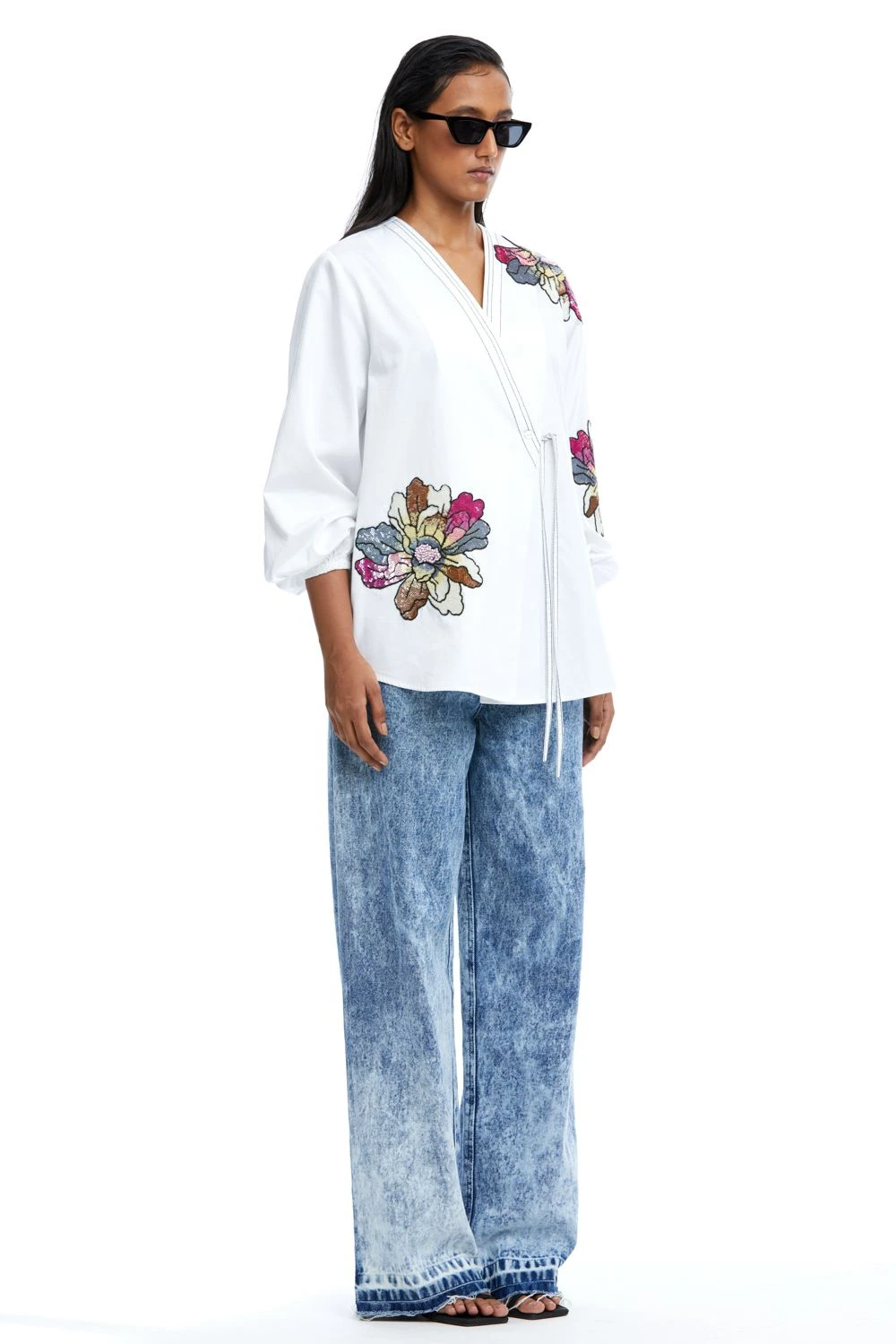 Experience elegance with this White Hand-Embellished Shirt. The delicate front tie adds a touch of sophistication to this versatile piece, making it a must-have for your wardrobe.