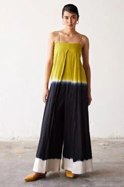 Elevate your style with this stunning lime-green, black, and white ombre jumpsuit. Featuring exquisite front pleat detailing, a chic zipper back opening, and a charming tie-up at the back for a touch of sophistication.