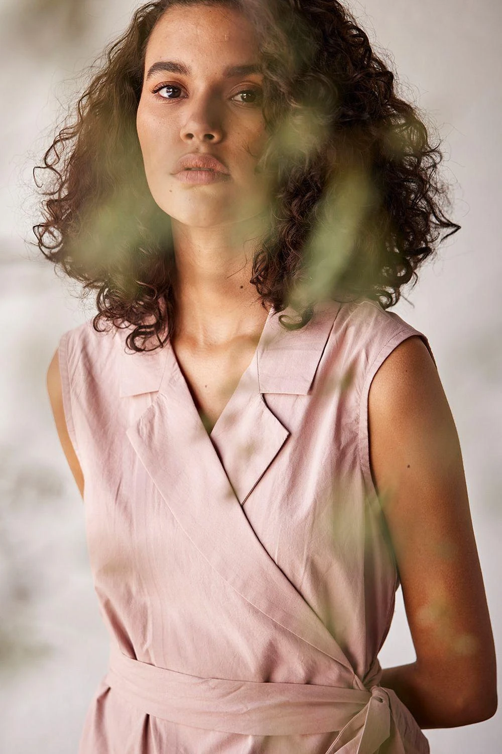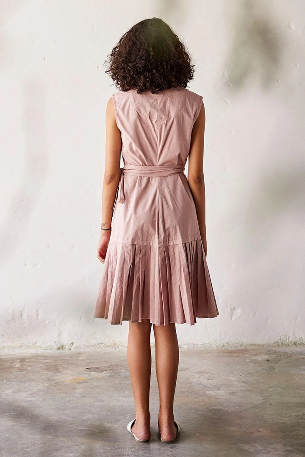 Elevate your style with this crepe pink poplin wrap dress. Featuring a front tie-up opening, a graceful surplice neckline, and a knife-pleated tier at the hem, it’s a symbol of effortless sophistication.