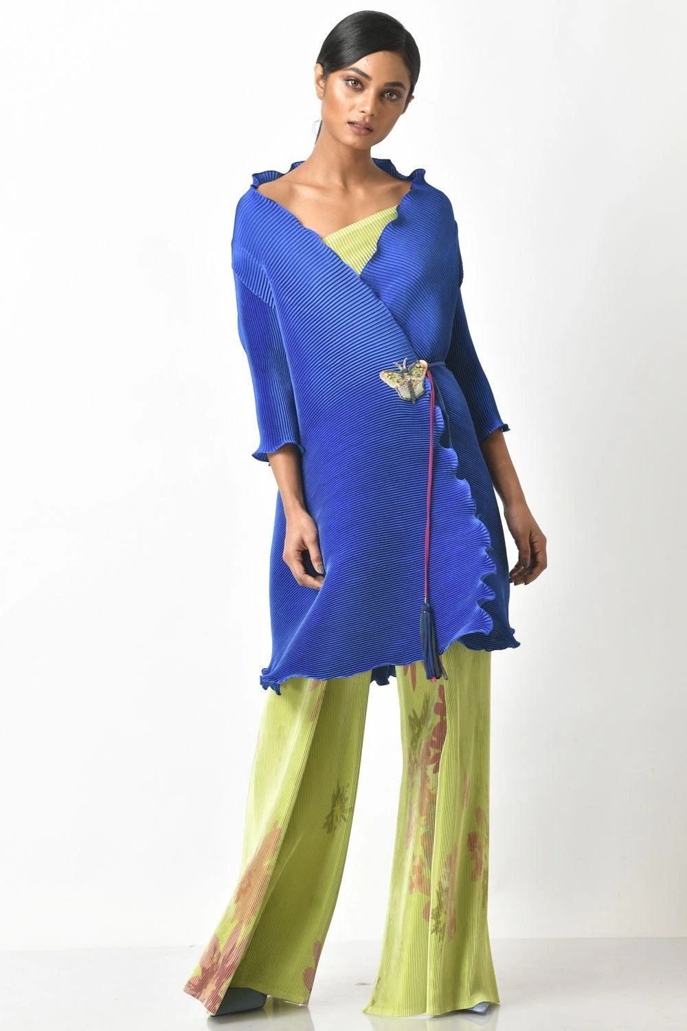 Elevate your subtle looks with these lime pleated wide leg pants. Set in a pleated polyester mix, they are enhanced with elegant prints. You can team it up with a wrap from the collection for a festive look.
