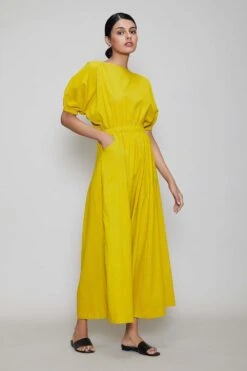 A vibrant, playful & super comfortable jumpsuit made in a modish yellow palette in cotton. It features back button closure with side pockets and a smocking waist. A perfect pick to go from day to night in easy & style.