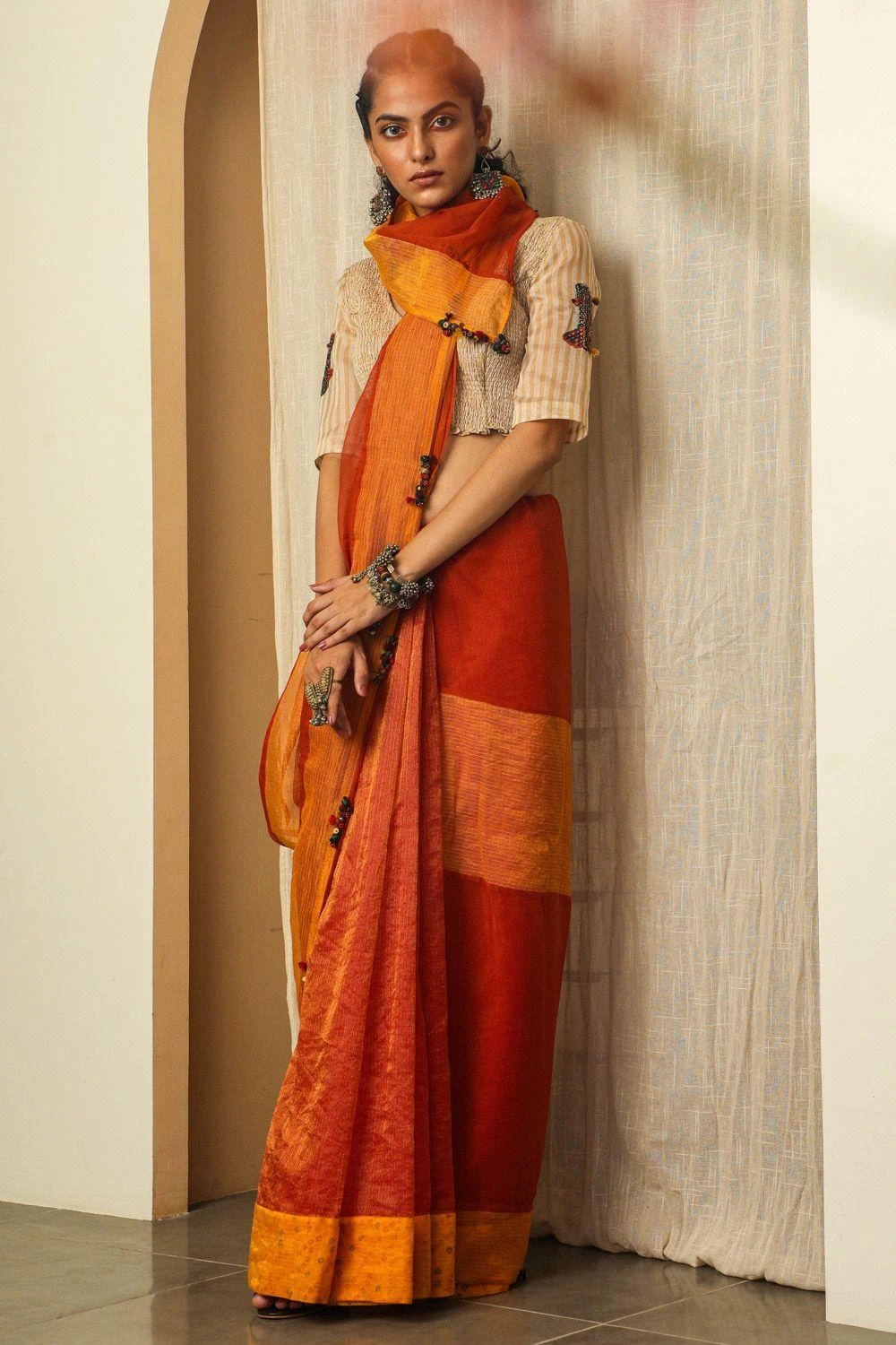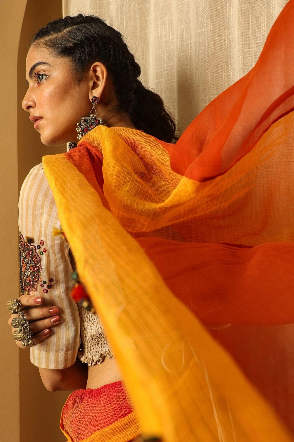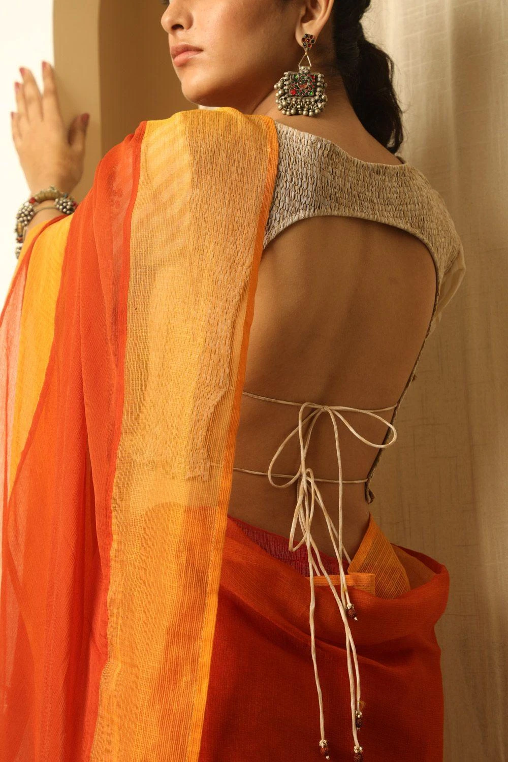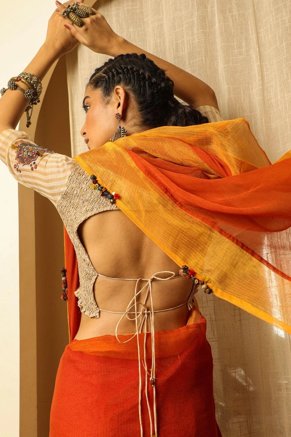 This statement ivory blouse will effortlessly complement your handloom saris. It is woven in striped chanderi and enhanced with a hand embroidered motif with zardosi technique. It features a bare back with tie-up details.
