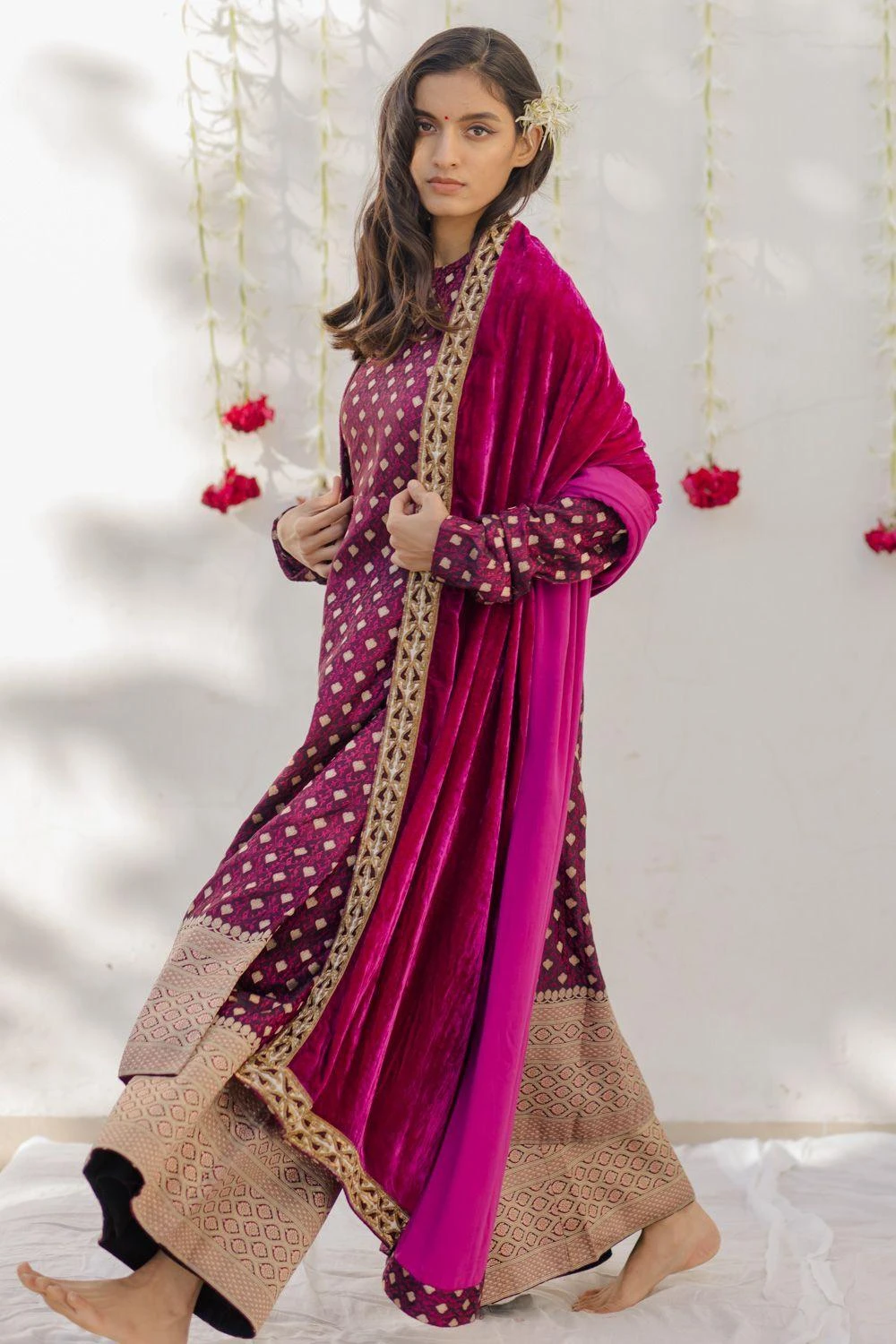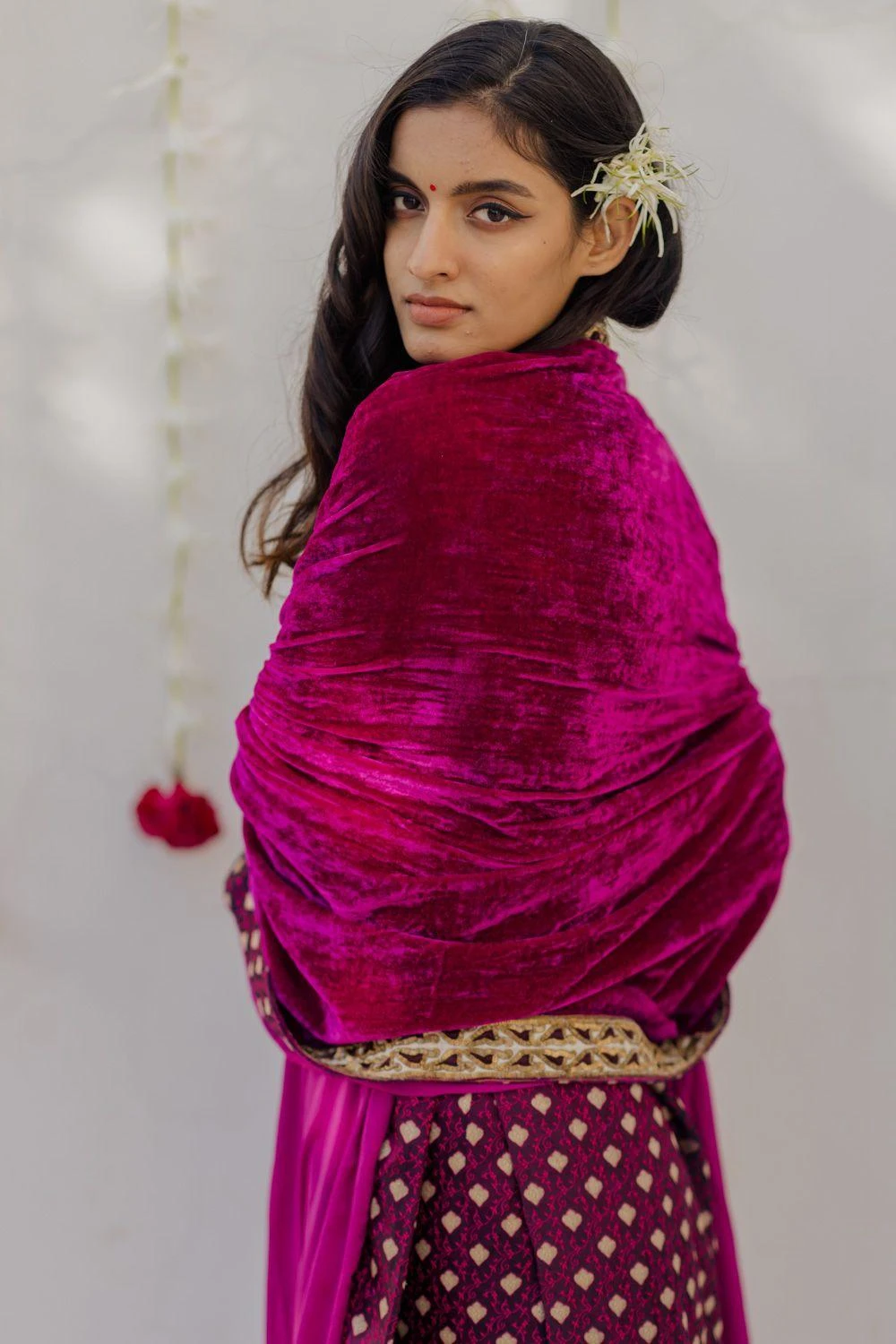 Indulge in Mimamsaa’s understated luxury & fine craftsmanship with this magenta sharara set. The kurta & sharara are woven in rich silk brocade fabric and come with an embroidered velvet dupatta. You can adorn a pair of jhumkas with this look.