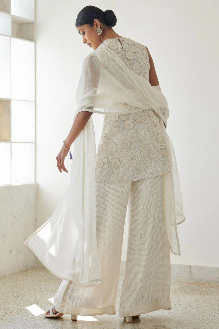 The perfect amalgamation of style and comfort, this sharara set works across occasions. Crafted in organza, this set features a floral embellished sequinned kurta paired with a coordinating sharara & dupatta.