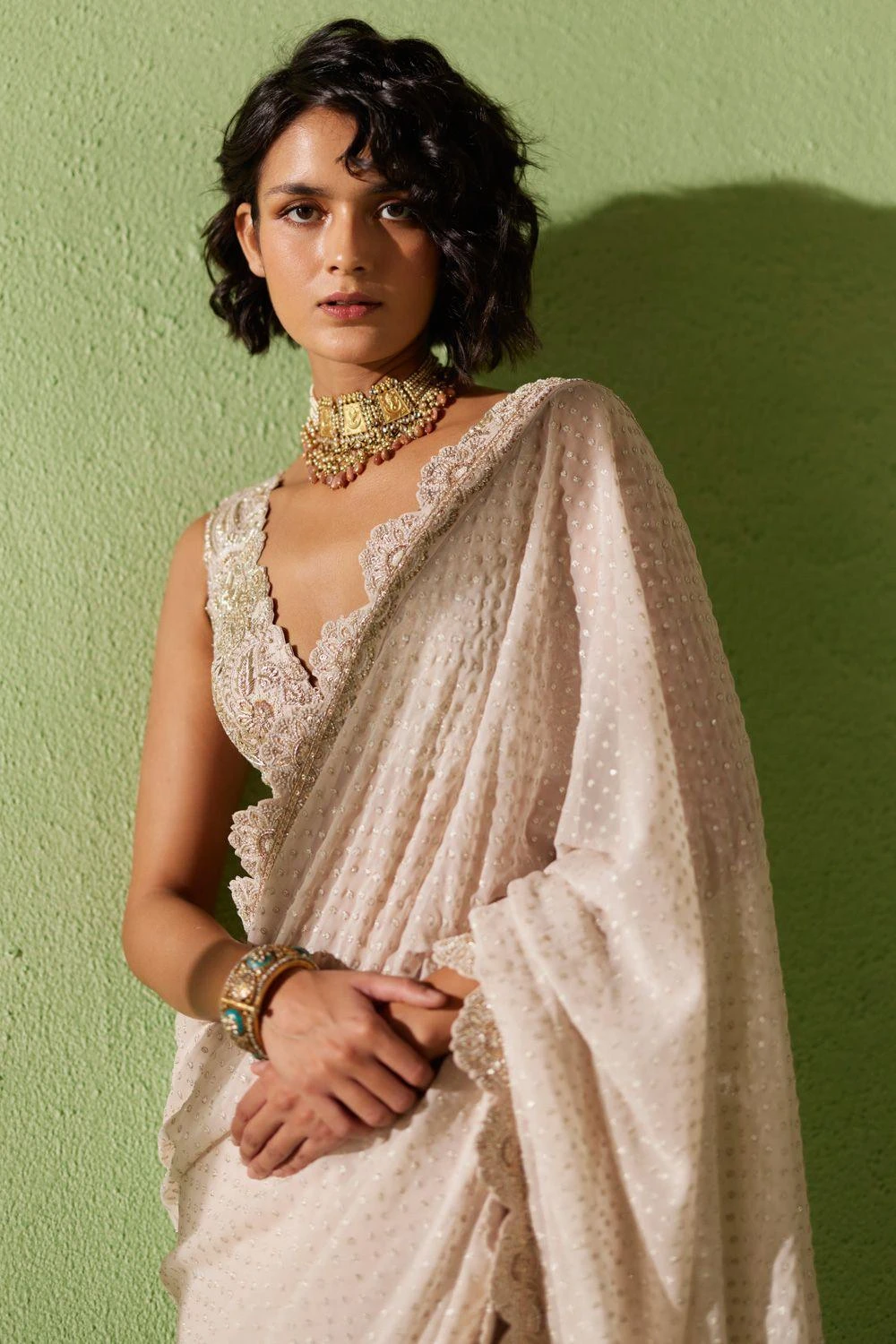 Elevate your style with this Ivory sleeveless blouse, boasting a plunge neckline and adorned with exquisite ivory resham, zardozi, and pearl hand embroidery. A perfect choice for sophisticated elegance.