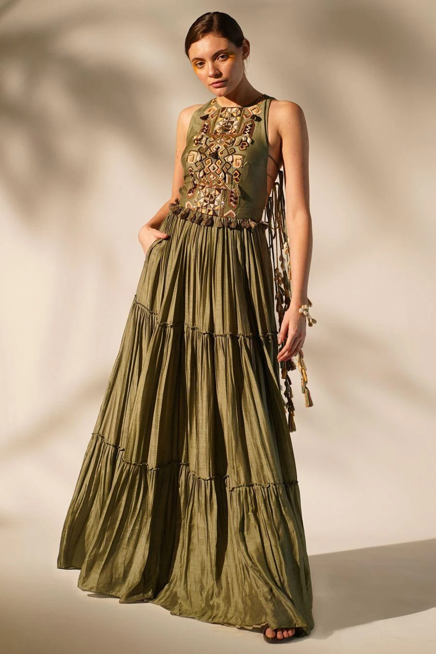 Add a layer of statement and glamour to your resort getaways with this olive green dress. Crafted in mul silk, this halter neck maxi dress features hand done thread & wooden embellishments.