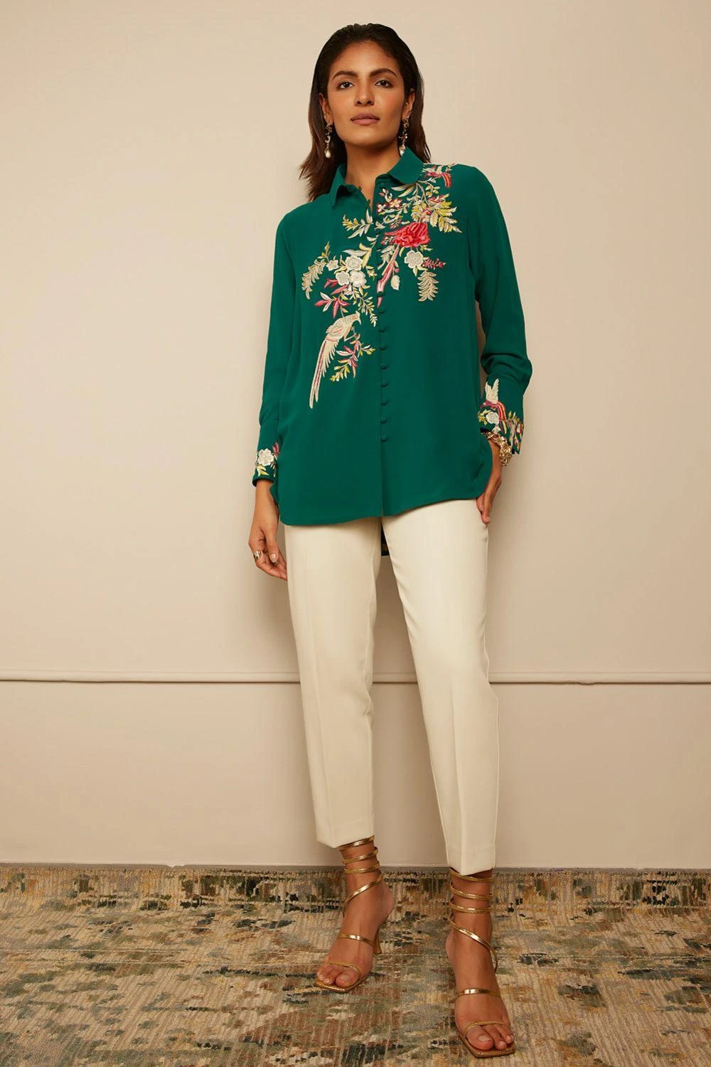 The jewel tones and rich gara embroidery of this emerald green shirt make it a must-have for any special occasion. It is cut in luxurious silk crepe fabric and features a front buttoned placket.