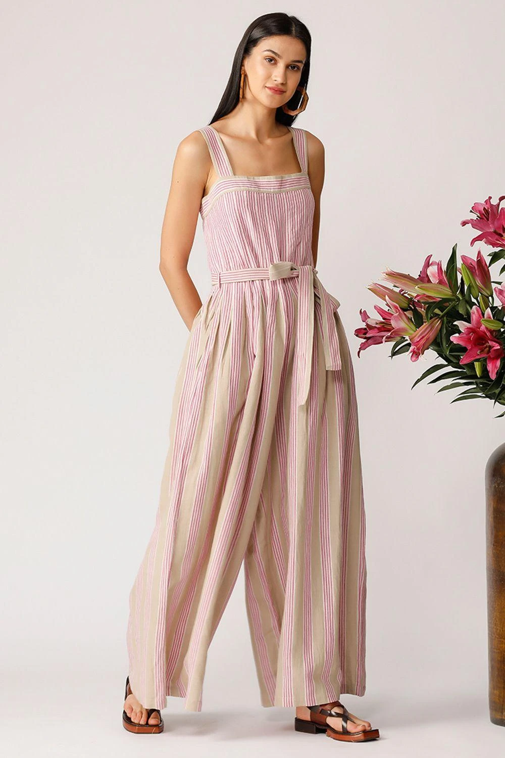 This elegant belted jumpsuit is cut in a pink handloom linen . This elegant set is perfect for summer daytime events. Style this with wedges or moccasins for a stylish look.