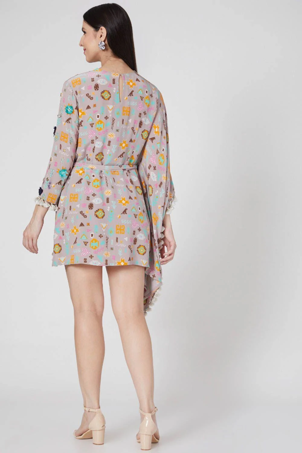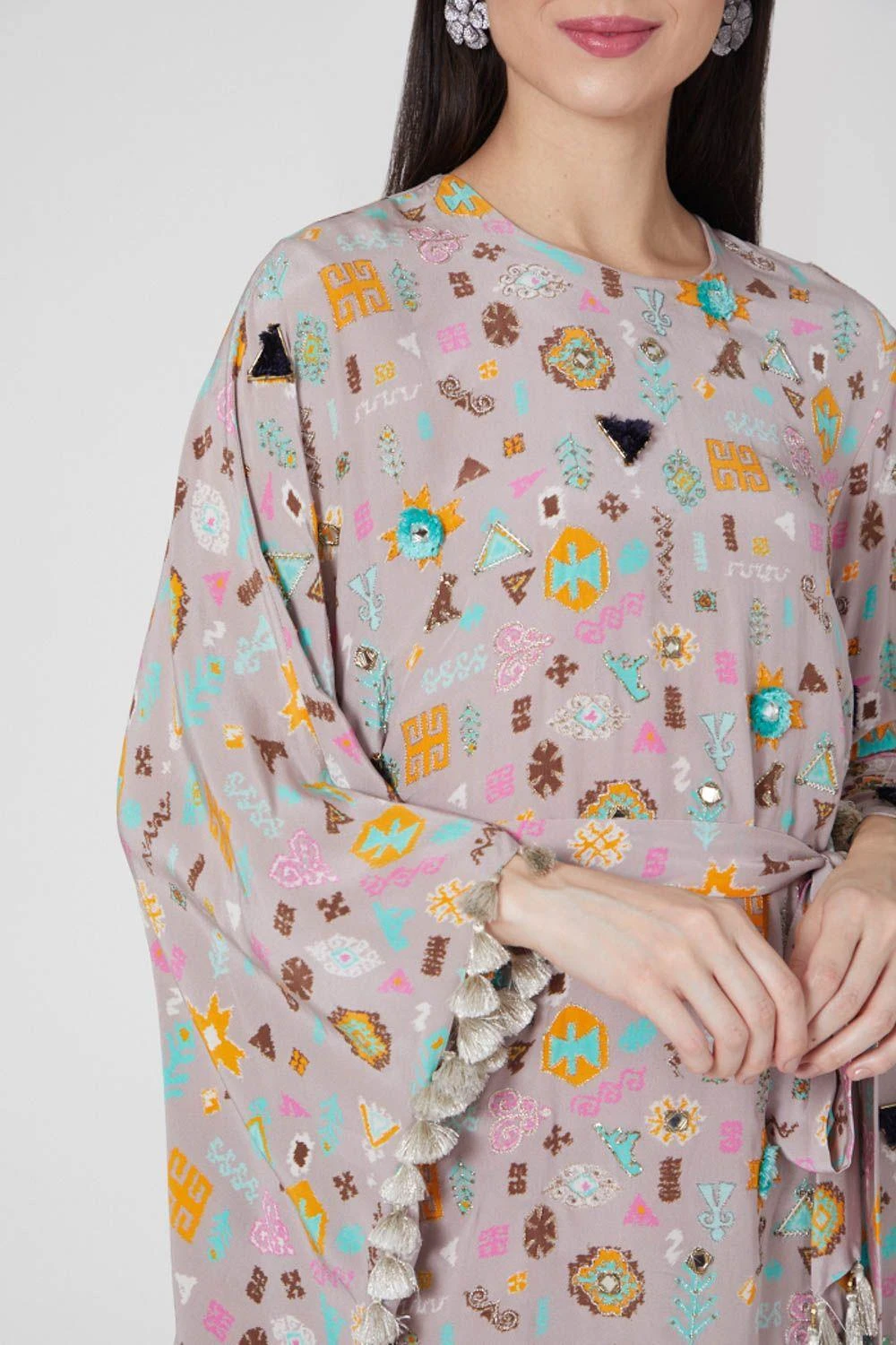 The perfect amalgamation of style & comfort, this dress is perfect for a day out. Crafted in crepe, this kaftan style dress features a bandhani kilim print & embroidered details. Style it with a pair of dangler earrings to complete the look.