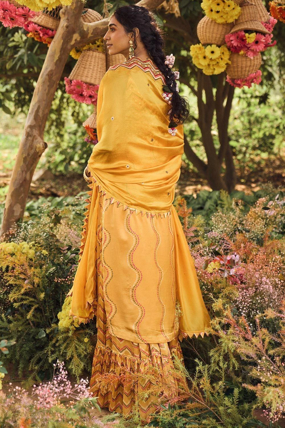 This festive season, amp up your ethnic style with this vibrant sharara set. It features a mustard sleeveless kurta enhanced with resham patra & cutwork, paired with printed gharara pants & a dupatta. Style it with a polki choker & bangles.