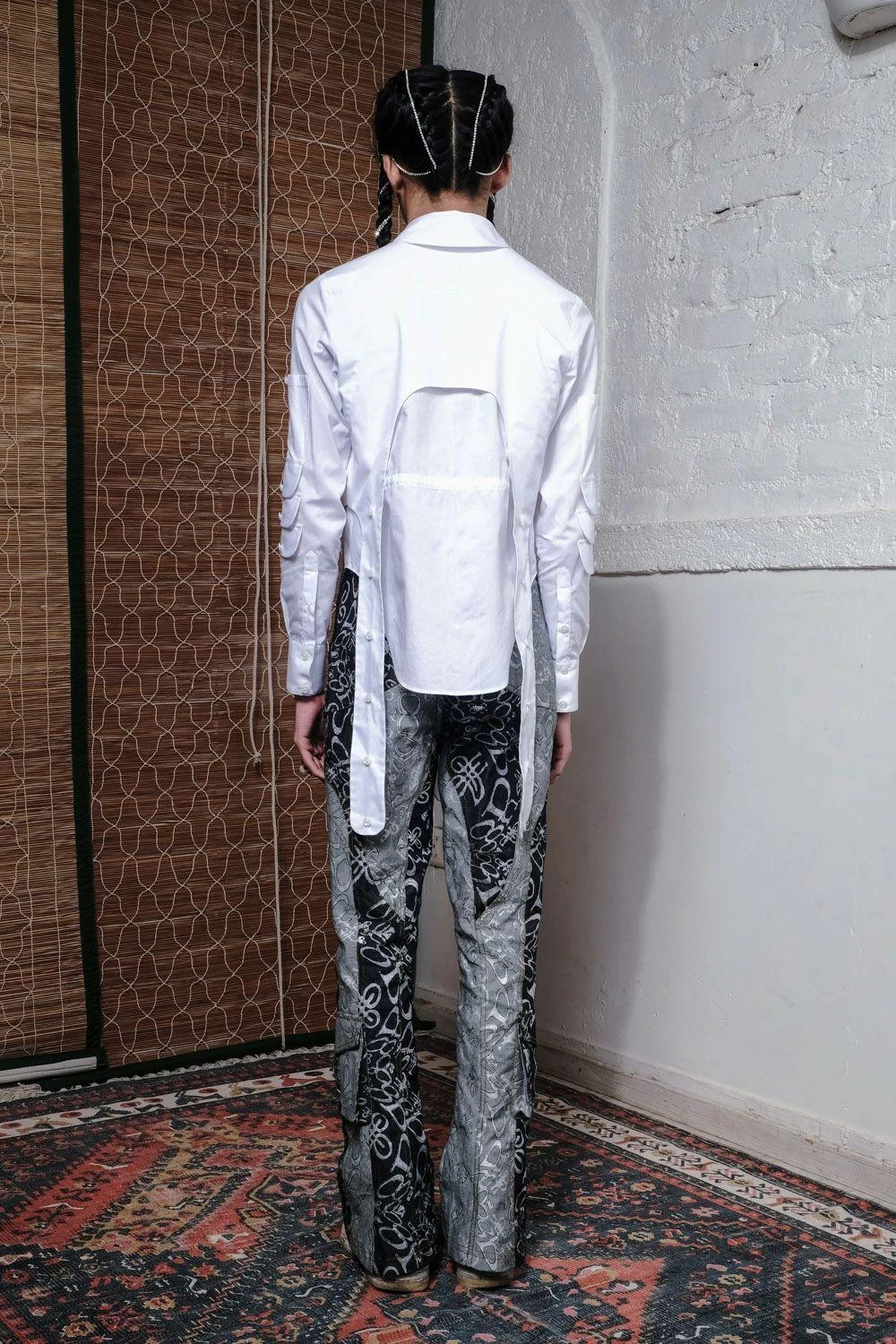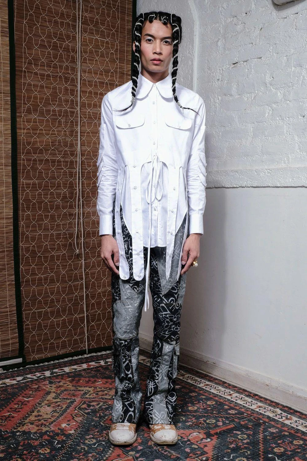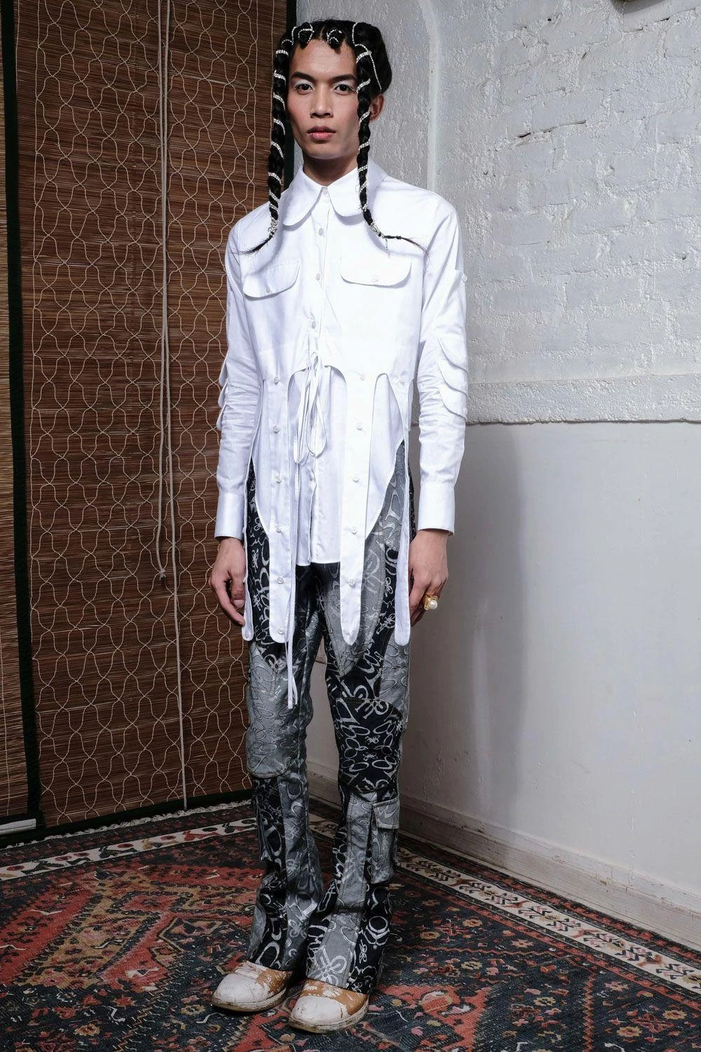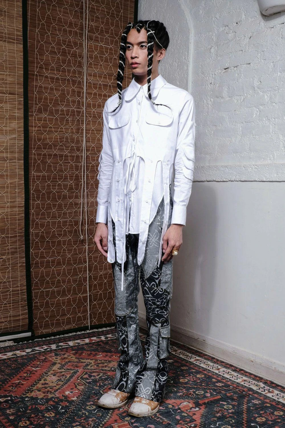 Infuse rodeo flair into your style with this crisp white poplin shirt. Adorned with multiple hanging straps, adjustable drawstrings at the waist, and a uniquely shaped hemline for a touch of modern chic.