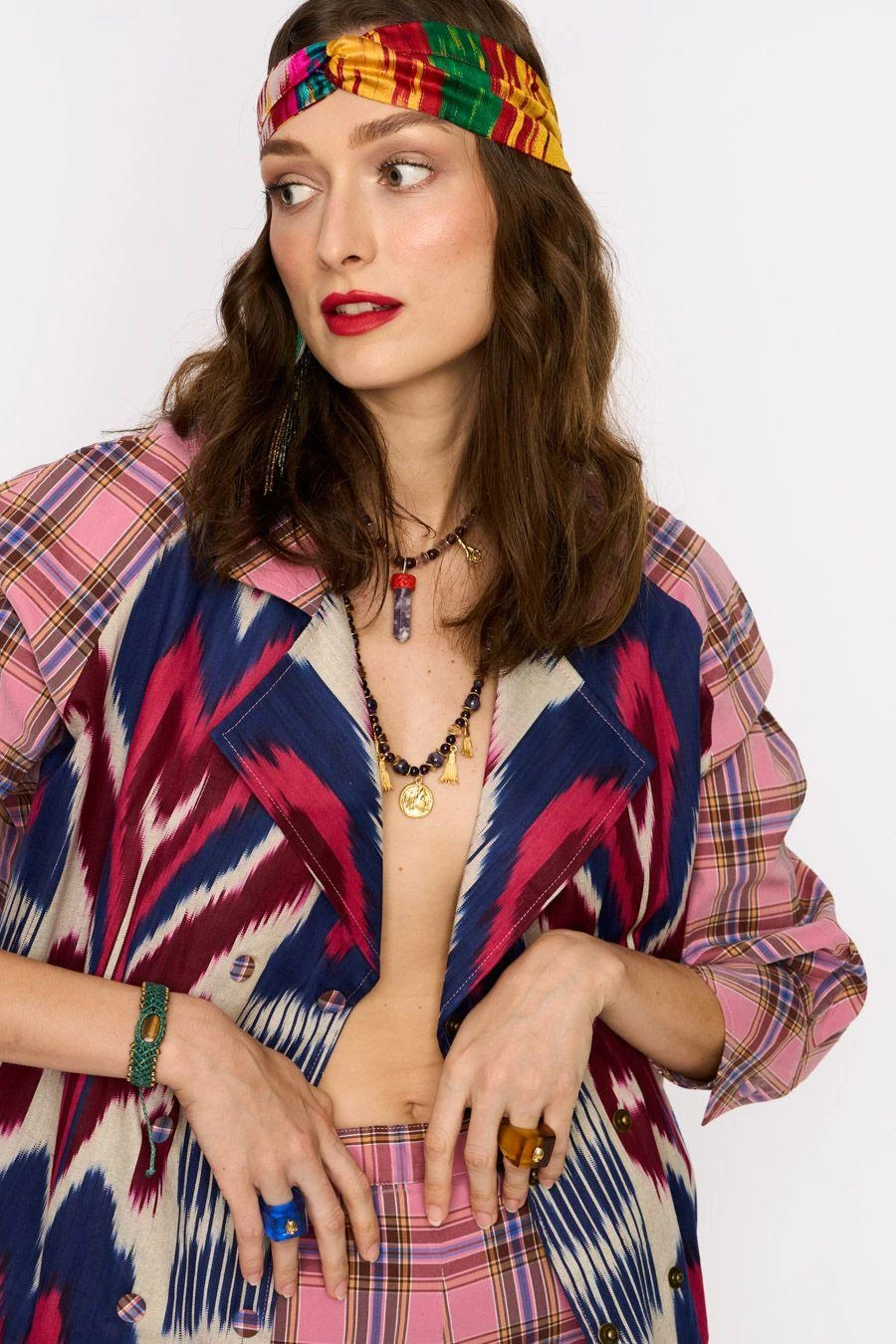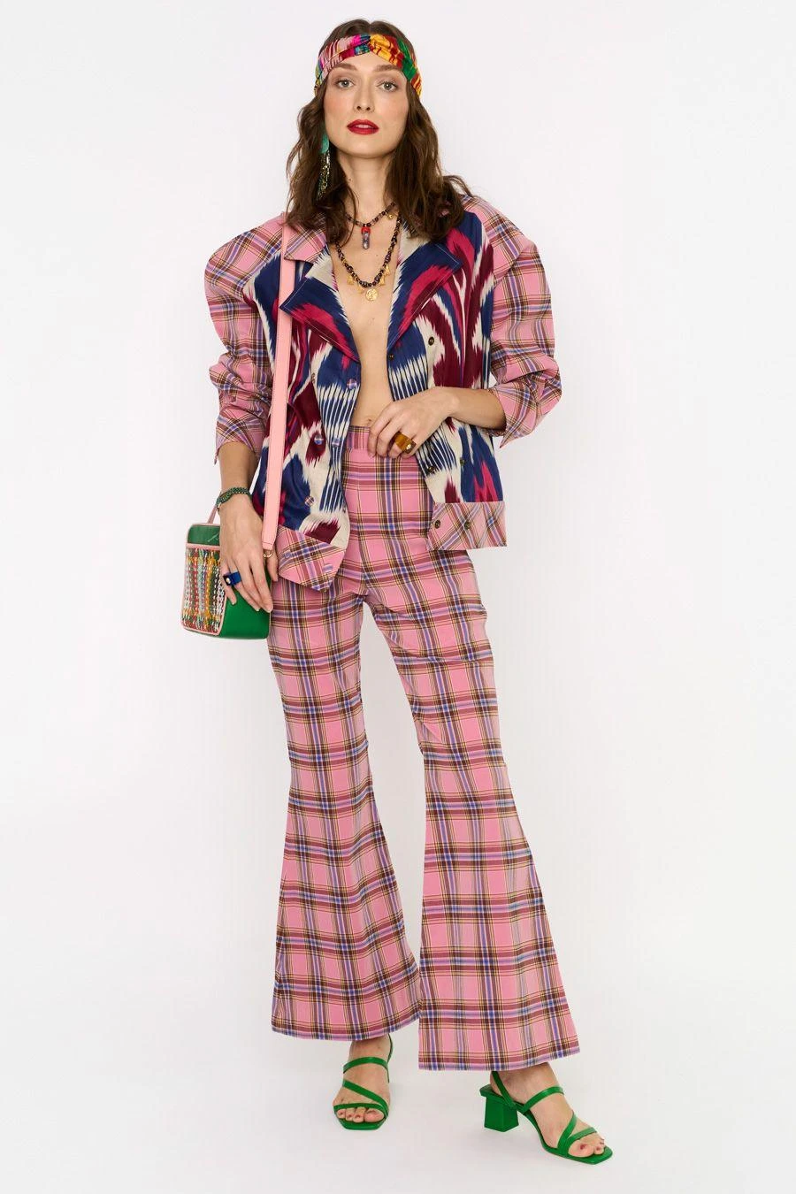 Crafted in cotton lycra, these flared pants feature a checkered print all over. Pair it with the Pink Uzbeki ikat bomber jacket from the collection to complete the set.