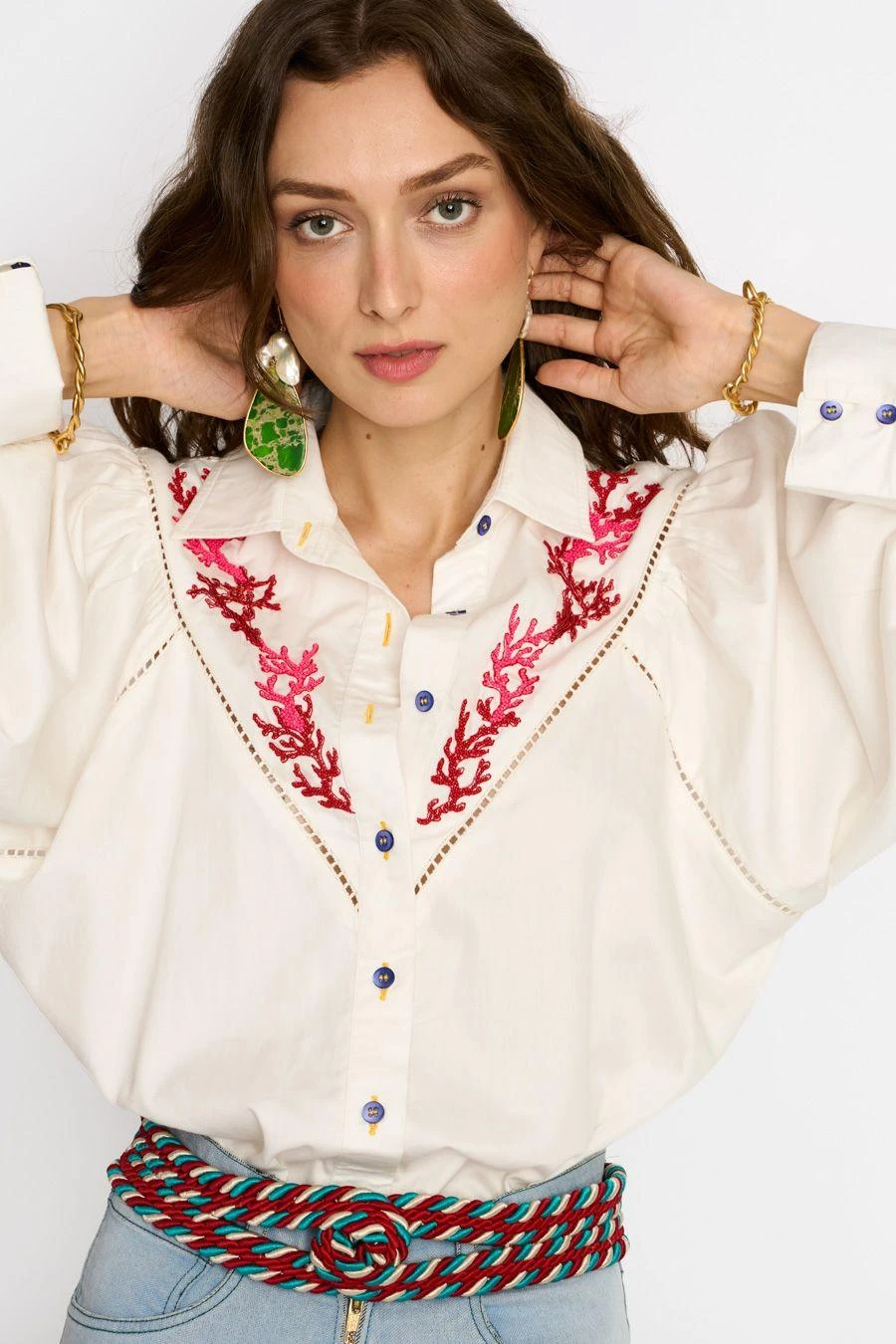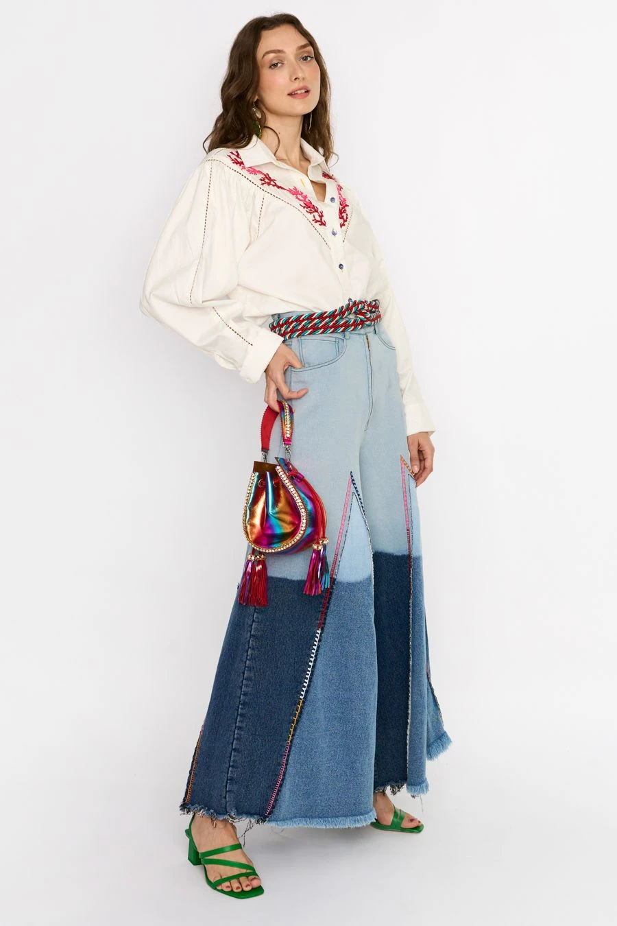 Elevate your nautical style wardrobe this summer with these one of a kind pants. Crafted in cotton, these washed blue flared denim feature hand embellished details. Pair it with a relaxed fit white shirt from the collection to complete the set.